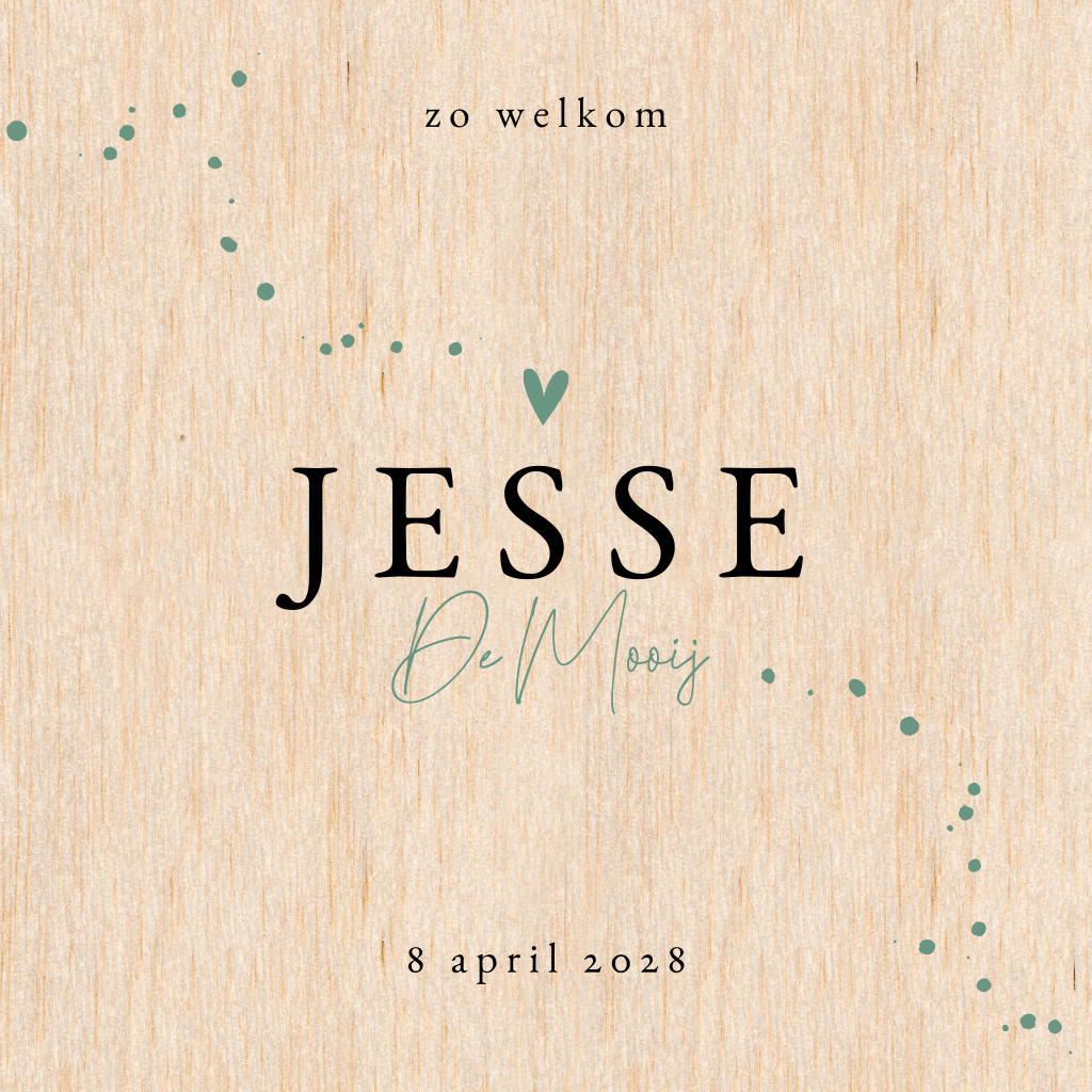 Houten geboortekaartje met klassieke typografie en groen hartje en spetters. Kondig de komst van je zoontje aan met dit bijzondere kaartje van hout.