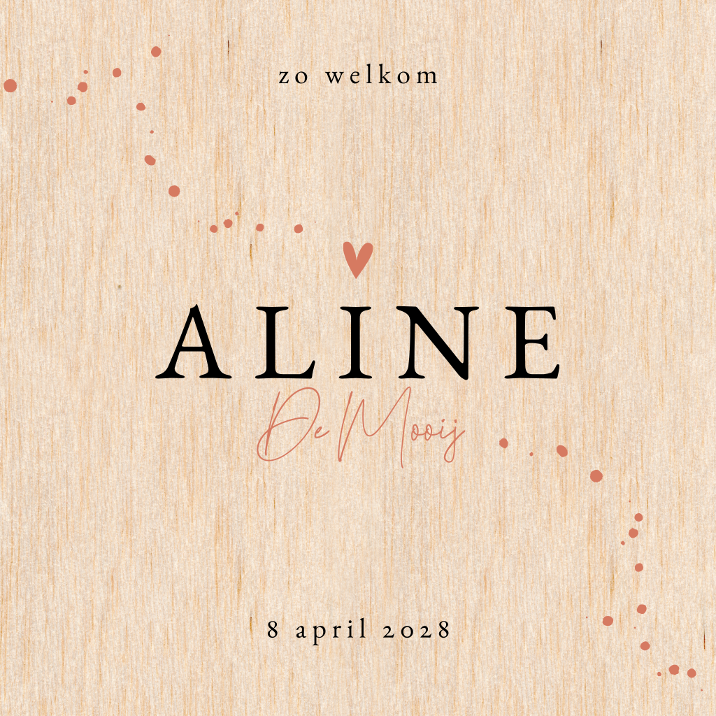 Vierkant geboortekaartje van echt hout met klassieke typografie en terra hartje en spetters. Een eenvoudig opgemaakt kaartje, maar toch bijzonder door het unieke materiaal: echt berkenhout. De afgeronde hoeken maken dit kaartje helemaal af.