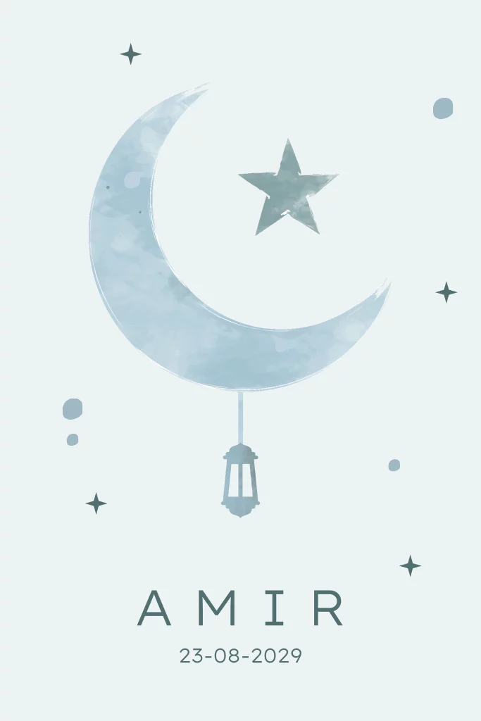 Dit geboortekaartje is perfect voor de geboorte van jullie zoon. Het ontwerp toont een waterverf maansikkel met ster in groenblauwe waterverftinten, met daaronder een kleine lantaarn – een knipoog naar islamitische tradities.