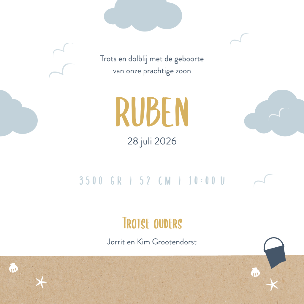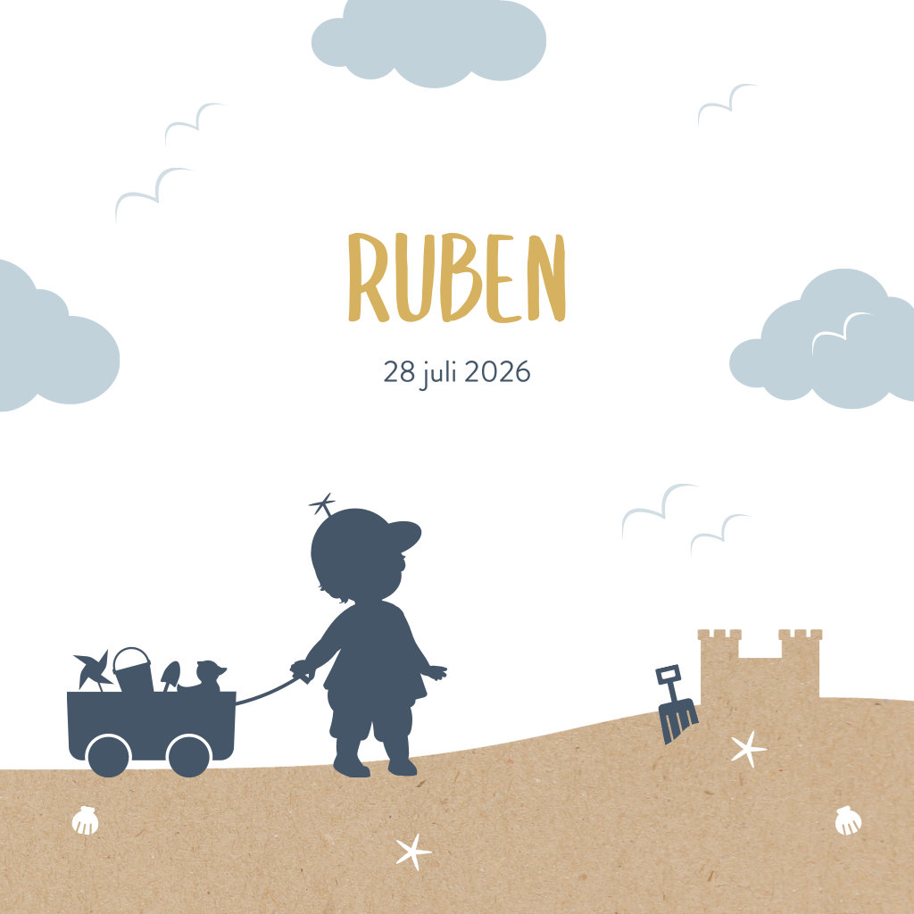 Zomer geboortekaartje met silhouet jongetje met strandkar op het strand. Uitgerekend in de zomer? Dan is dit lieve silhouet geboortekaartje vast iets voor jou! Op de voorkant zie je een jongetje met een strandkar en speelgoed bij een zandkasteel, omringd door wolkjes en meeuwen. De kleuren kun je naar wens aanpassen. Bestel een drukproef en bekijk het resultaat in het echt.