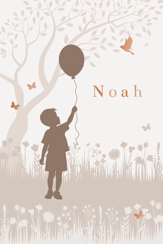 Vier de aankomst van je zoontje met dit betoverende geboortekaartje. Een schattig ontwerp in beige, waar een silhouet jongetje een ballon vasthoudt, omringd door bloemen, vlinders en een vogeltje. Perfect voor een jongetje dat geboren wordt in de lente of zomer! De naam van je kleine, plus vlinders en vogel, worden in prachtige hoogglans gedrukt. Vrolijk, tijdloos en lief, kondig de komst van je jongen aan met dit leuke geboortekaartje! Pas dit ontwerp zelf aan in onze editor en bestel een proefdruk.
