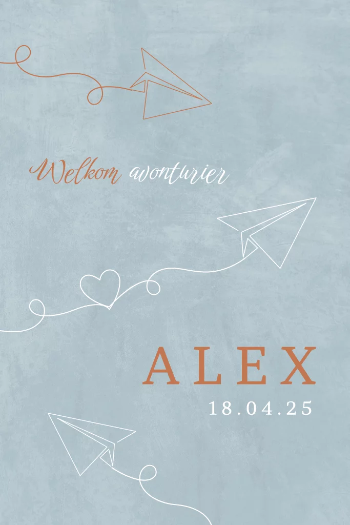 Dit geboortekaartje met papieren vliegtuigjes heeft een speels en modern ontwerp, perfect voor een jongetje. Met een zachte blauwe achtergrond en de tekst "Welkom avonturier" in roestbruin geven het kaartje een warme, persoonlijke touch. Je kunt de kleuren, naam en andere teksten eenvoudig aanpassen via de online editor. Bestel een proefdruk om het eindresultaat te bekijken. Ideaal voor ouders die op zoek zijn naar een stijlvol en avontuurlijk geboortekaartje!
