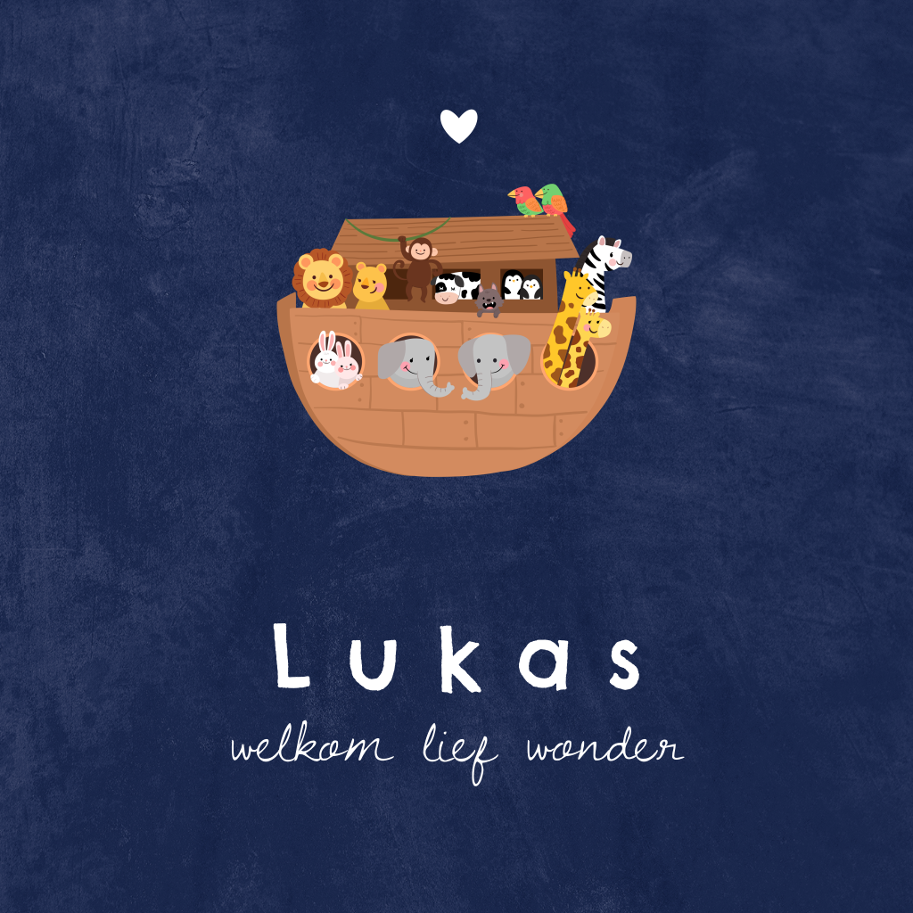 Vrolijk geboortekaartje in donkerblauwe kleur met goudfolie naam en illustratie van de ark van Noach. Een leuke kaart om de komst van je zoontje mee aan te kondigen aan vrienden en familie. Een aantal dieren komen op de achterkant van dit enkele kaartje terug. Perfect als je op zoek bent naar een geboortekaartje met Christelijk thema. Pas dit kaartje naar eigen wens aan in onze editor en bestel een proefdruk.