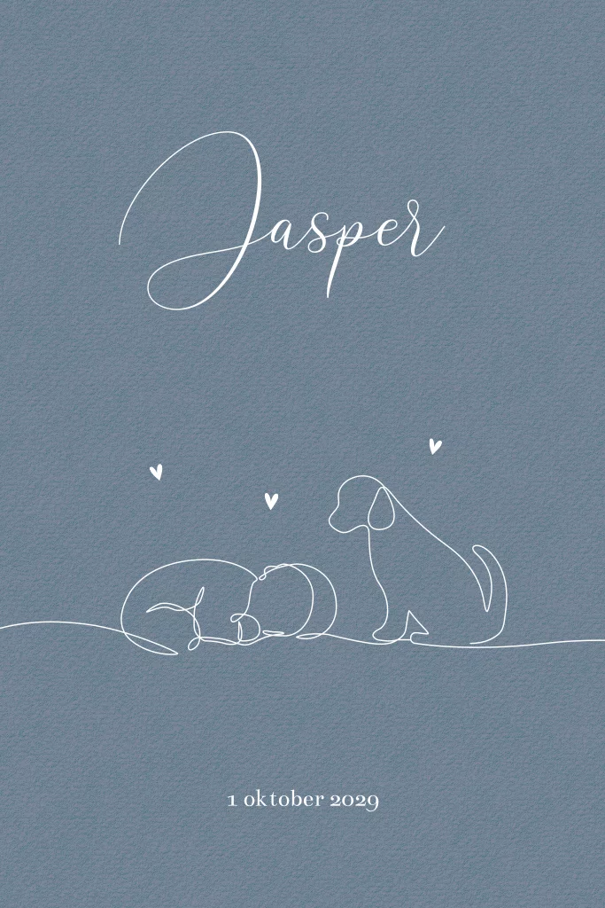 Dit stijlvolle geboortekaartje heeft een blauwe achtergrond, waarop een witte lijntekening staat van een slapende baby met een hondje ernaast. De naam Jasper staat sierlijk in het midden van de kaart. Het ontwerp maakt dit kaartje een perfecte keuze voor de geboorte van een jongen. Pas in een paar stappen aan met de designtool en bestel een proefdruk.