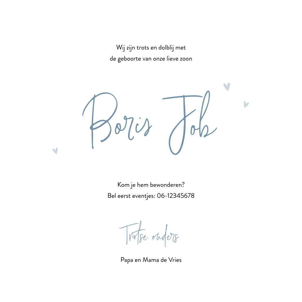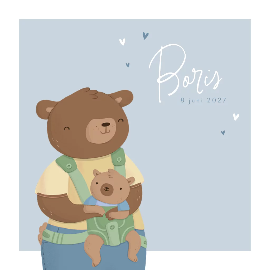 Blauw geboortekaartje met getekende beertjes en hartjes. Op dit originele en lieve geboortekaartje staat een illustratie van een beer met een baby beertje in een draagzak. Schattig, toch? De rest van de vormgeving van deze kaart is vrij strak en eenvoudig, daardoor springen de getekende beertjes er extra uit. Aan de binnenzijde komt de tekening nogmaals terug en is er genoeg ruimte voor alle geboortegegevens van je pasgeboren zoontje. De kleine hartjes maken dit ontwerp helemaal af.