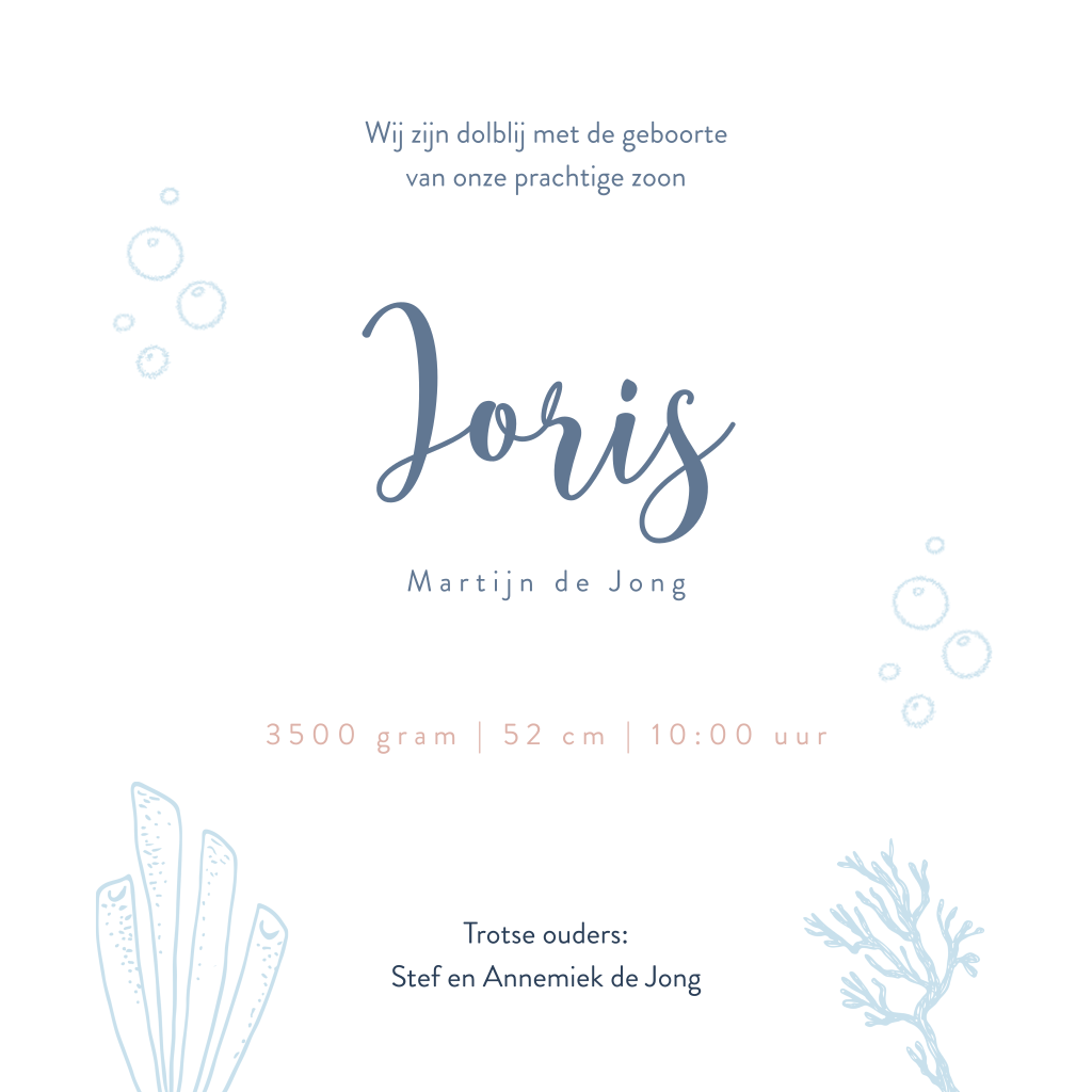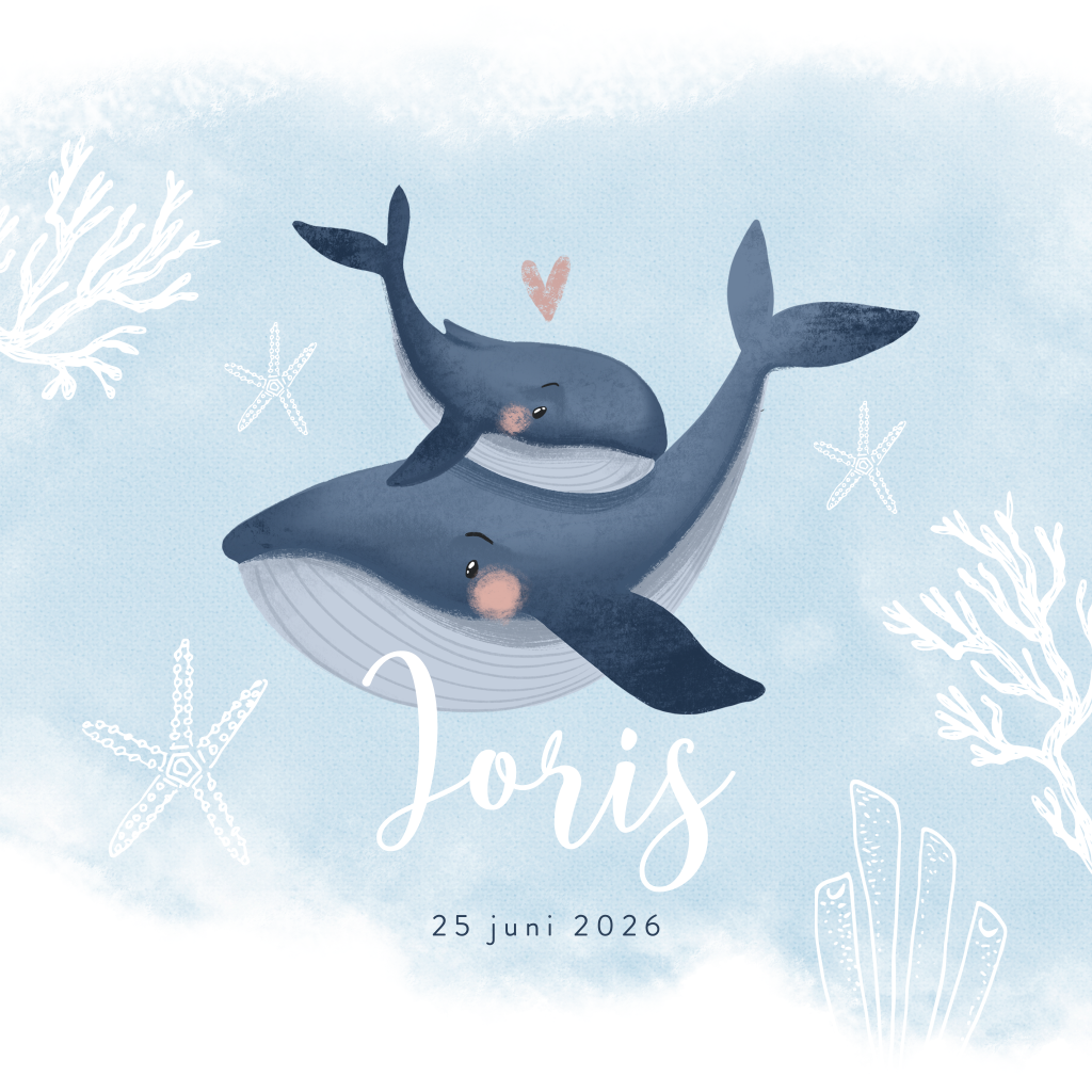 Blauw geboortekaartje onderwater met getekende walvis en baby walvis. Op zoek naar een leuk geboortekaartje met het thema onderwater? Dan is dit getekende kaartje misschien wel wat voor jou. De kaart heeft een zachtblauwe achtergrond, geschilderd met waterverf. De kaart wordt versierd met zeewier en onderwater plantjes. Voorop zie je een mooie illustratie van twee walvissen. Pas het ontwerp naar wens aan.