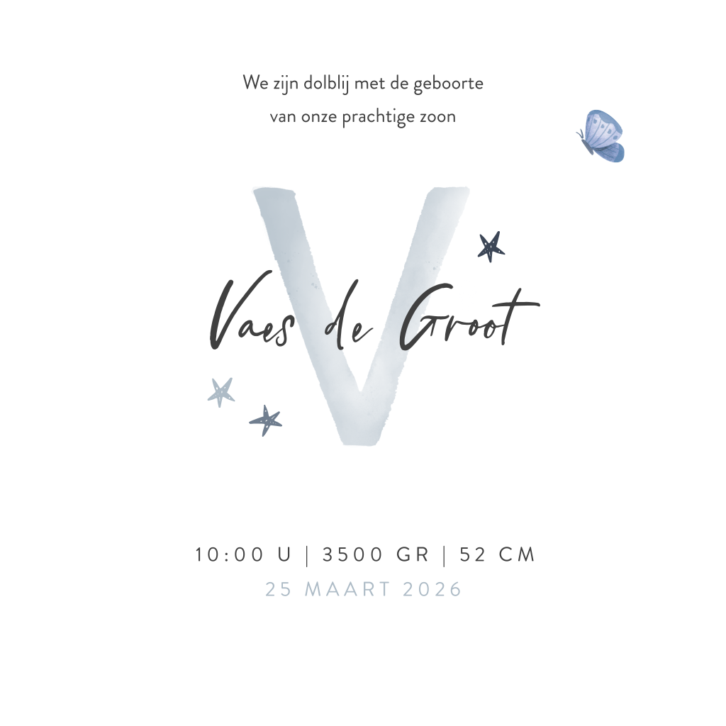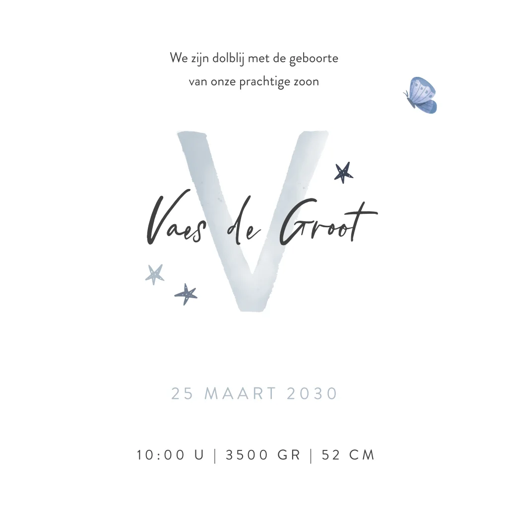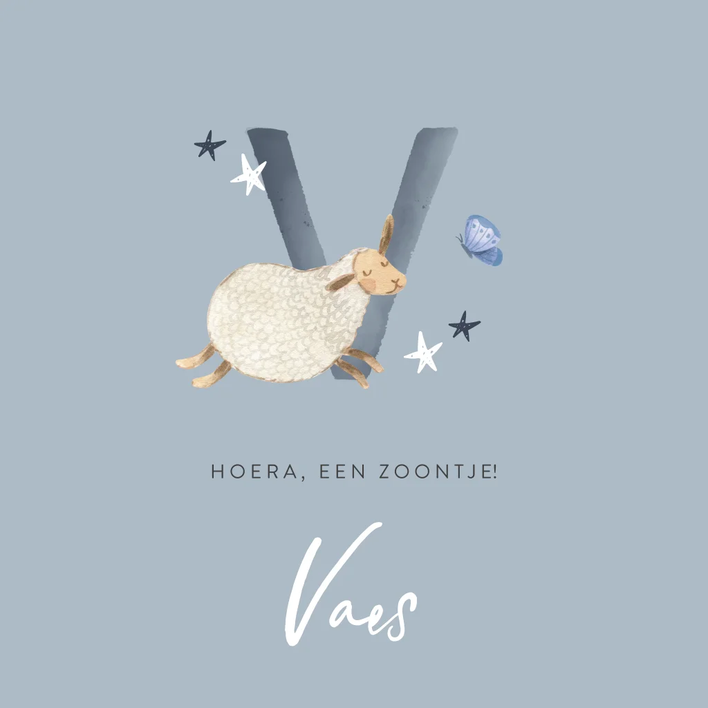 Blauw geboortekaartje met schaapje, vlinders en initiaal. Op zoek naar een speels ontwerp voor het geboortekaartje van je pasgeboren zoontje? Wat dacht je van dit leuke ontwerp met lichtblauwe achtergrond en huppelend schaapje. Extra leuk aan dit ontwerp is de eerste letter van de naam van je zoontje die je zelf kunt wijzigen. Zoek je initiaal naar keuze in de map 'alfabet'. Zo kun je het kaartje gemakkelijk personaliseren. De vlindertjes en sterren rondom het initiaal maken het ontwerp helemaal compleet.