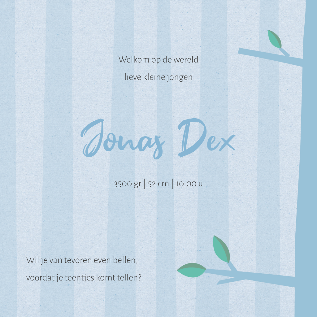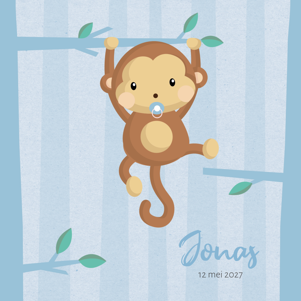 Op zoek naar een lief ontwerp om de geboorte van je zoontje mee aan te kondigen? Ga dan voor dit zoete ontwerp van een slingerend aapje met blauw speentje in. Aan de binnenzijde van dit vierkante kaartje kun je de gegevens van je zoontje plaatsen. Pas dit ontwerp zelf aan in onze ontwerptool.