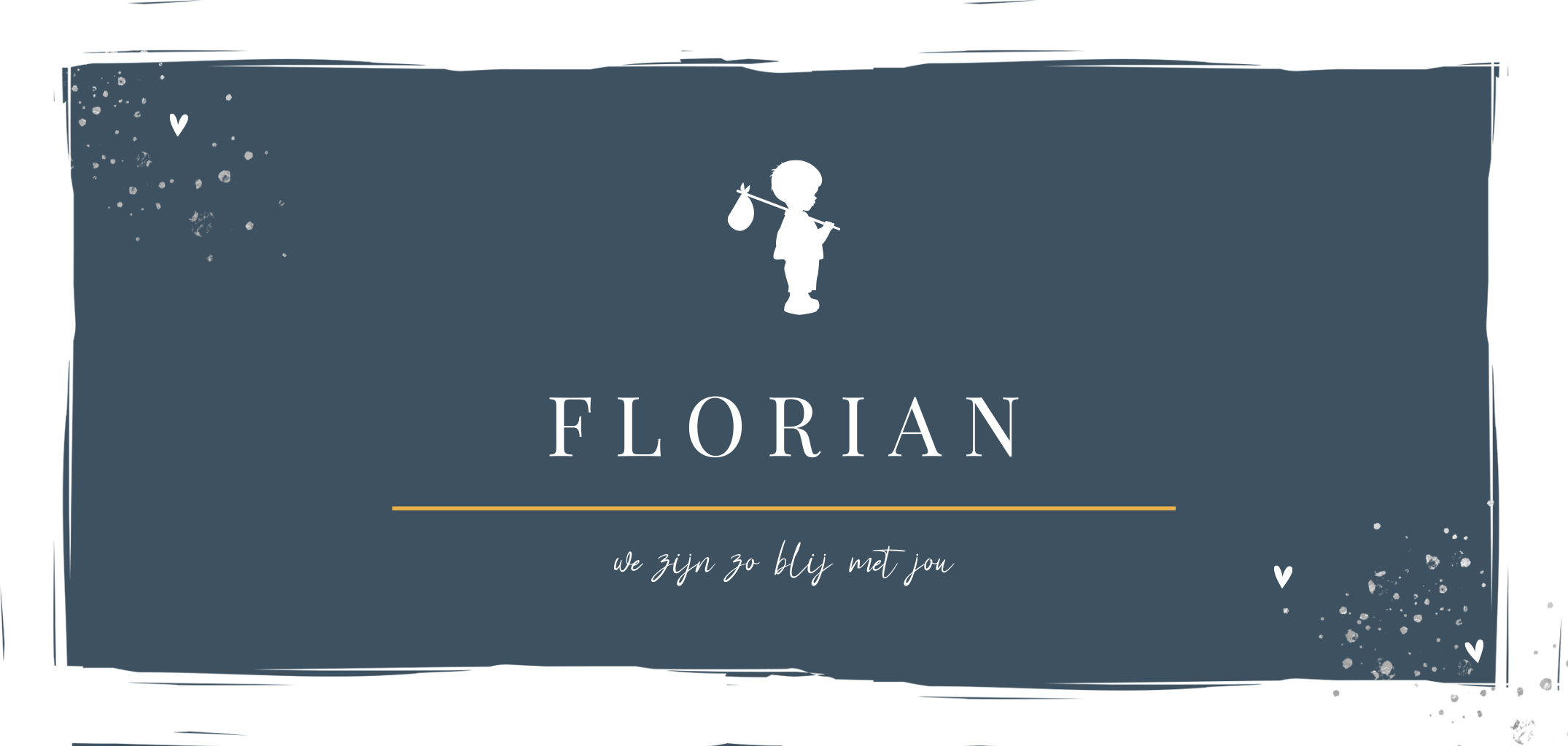 Stijlvol geboortekaartje met wit kader en donkerblauwe achtergrond. Met strakke, chique letters staat de naam van je zoontje onder een lief silhouetje. Het jongetje op de voorkant draagt een knapzak op zijn rug. De kaart is versierd met zilverkleurige spetters.