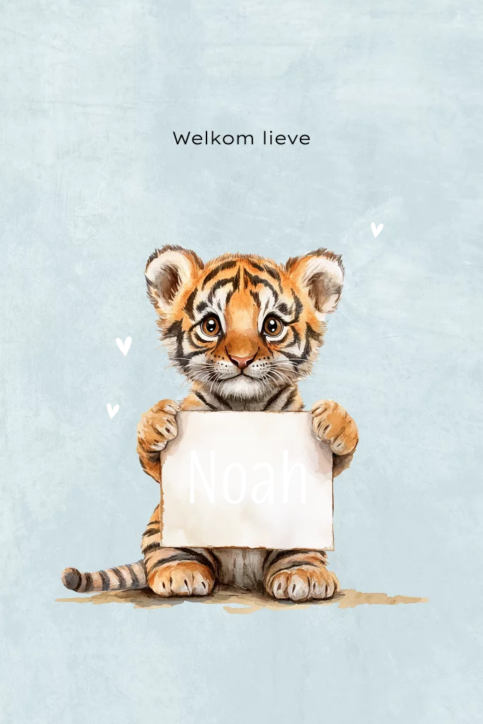 Blauw geboortekaartje met een schattig tijgertje dat een bordje vasthoudt, waarop de naam van je pasgeboren zoontje staat vermeld. Kleine hartjes geven het ontwerp een extra lief accent. De tekst en de hartjes zijn gedrukt in goudfolie. Pas de kaart eenvoudig aan naar jouw wensen met de handige editor.