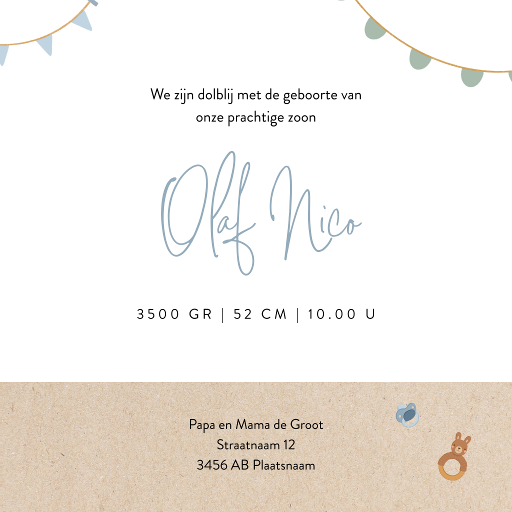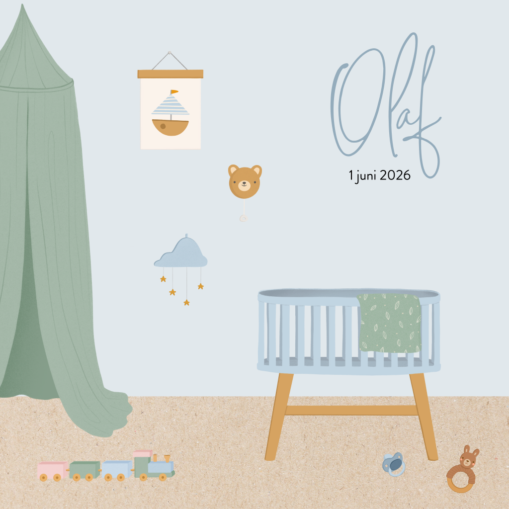 Blauw geboortekaartje voor de komst van een jongetje met geïllustreerd kinderkamertje. Lief geboortekaartje met blauw wiegje, groen hemeltje en diverse speelgoed. Met de tekeningen in onze ontwerptool kun je dit originele kaartje zelf aanpassen, bijvoorbeeld in de stijl van de babykamer van je pasgeboren zoontje. Voeg bijvoorbeeld slingertjes, een plankje of kleertjes toe of verschuif de huidige afbeeldingen. Aan de binnenzijde van dit kaartje komen de illustraties terug. Klaar met spelen in onze ontwerptool en benieuwd naar het eindresultaat? Bestel dan je eerste proefdruk.
