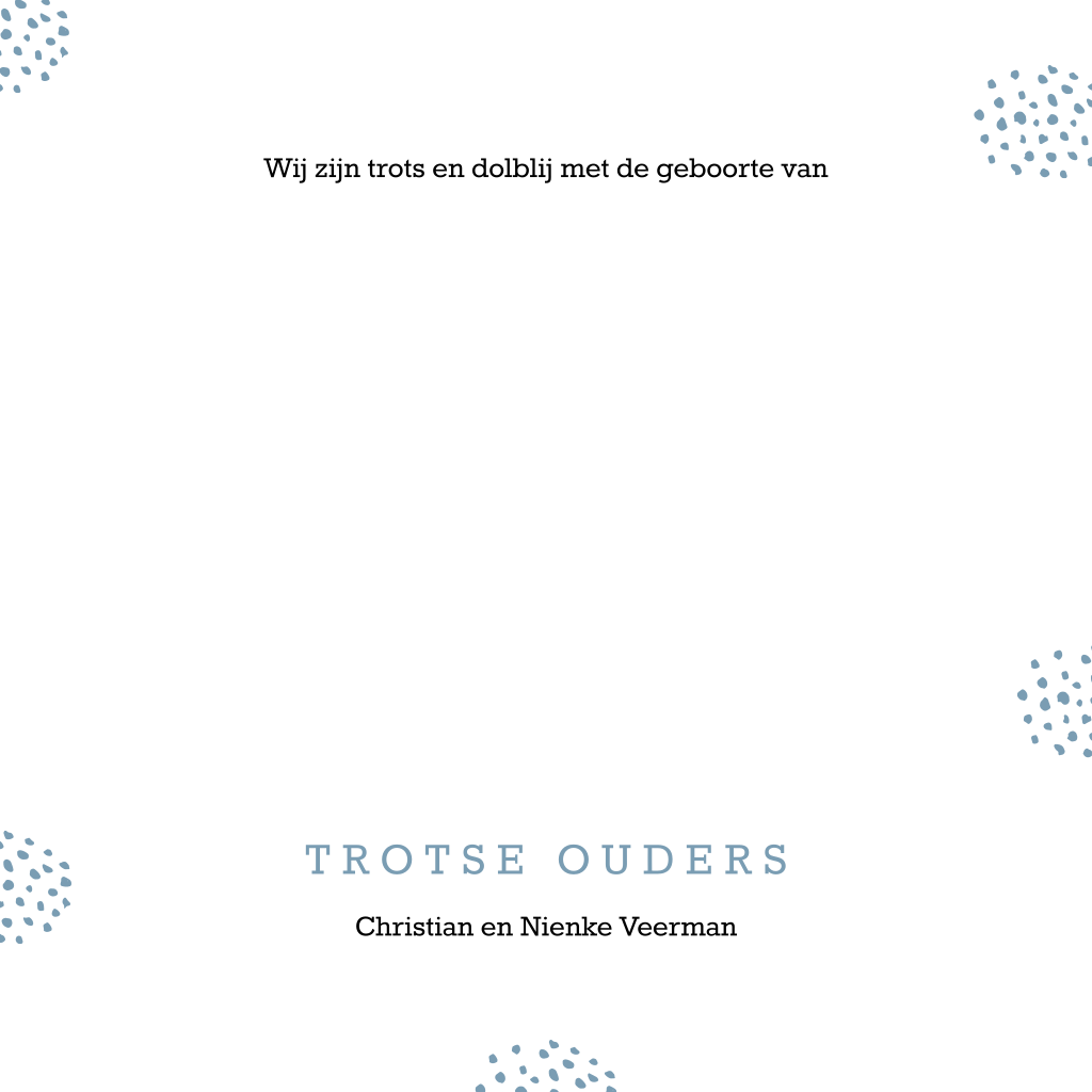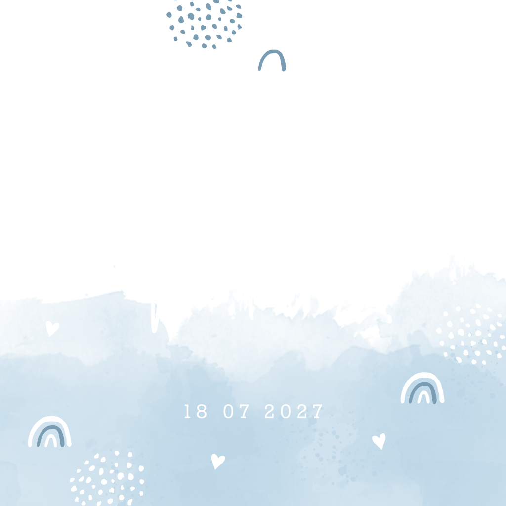 Lief, lichtblauw geboortekaartje met kleine regenboogjes in goudfolie. In een sierlijk lettertype komt de naam van je zoontje voorop. Op de achtergrond staat een waterverf rand, deze kun je eenvoudig omkleuren met behulp van onze ontwerptool. Bestel een proefdruk om dit kaartje in het echt te kunnen bewonderen.