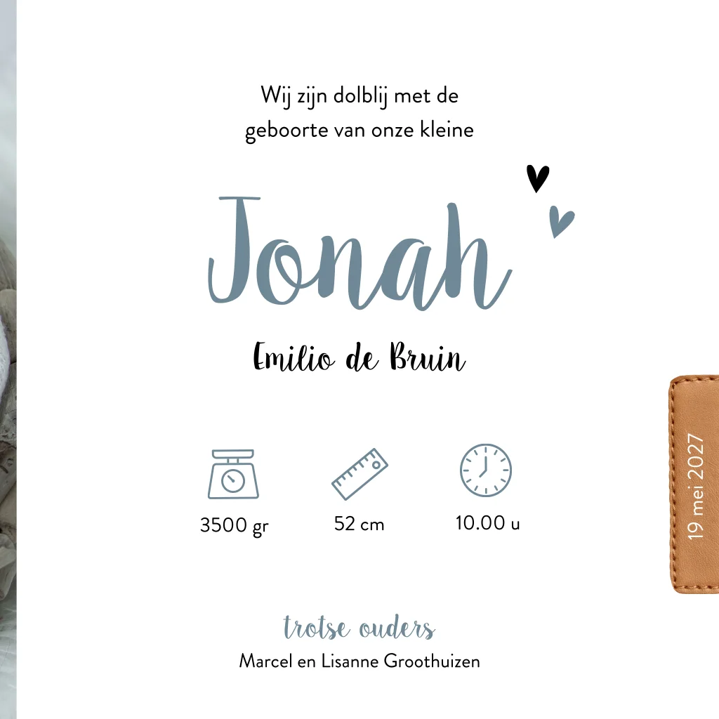 Heb jij mooie foto's laten maken van je pasgeboren zoontje? Dan is het natuurlijk extra leuk om deze op het geboortekaartje te plaatsen! Op dit geboortekaartjes kun je op zowel de voor- als binnenkant een grote foto kwijt. De kaart heeft een donkerblauwe achtergrond en is versierd met een bruin leren label (niet echt) en witte hartjes. Binnenin de kaart kun je rechts de geboortegegevens plaatsen.