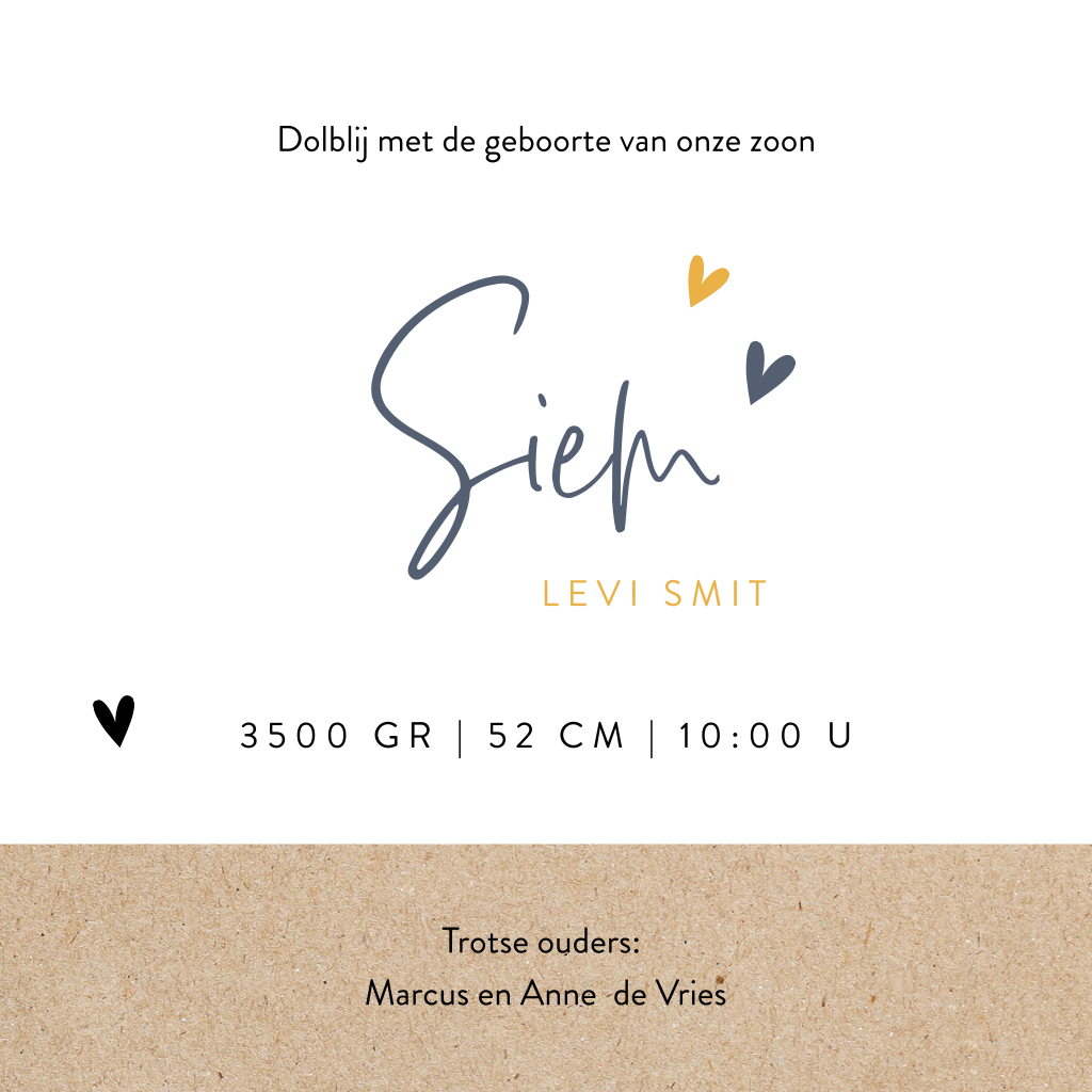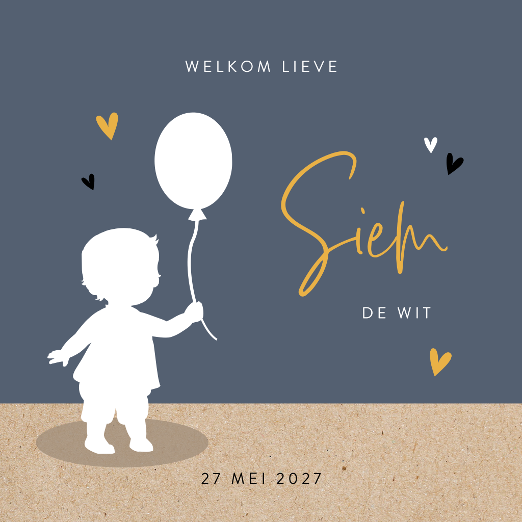 Vrolijk geboortekaartje met silhouet jongen met ballon en kleine hartjes. De blauwe achtergrondkleur kun je naar eigen wens aanpassen. Aan de binnenkant is ruimte voor een gedichtje en alle geboortegegevens van je zoontje.