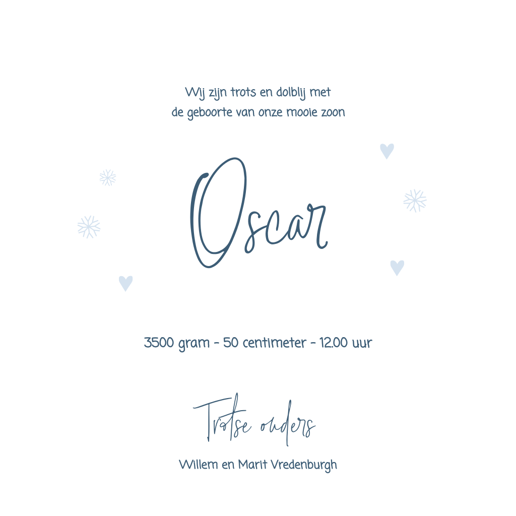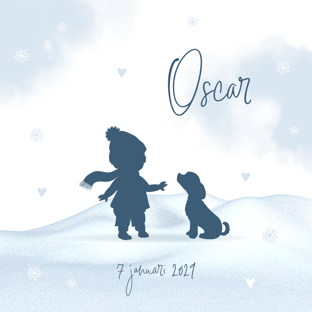 Een lief geboortekaartje voor een winterkindje. Op de voorkant van dit vierkante kaartje staat silhouetjes van een jongetje met zijn hondje in de sneeuw. In de kaart keert het jongetje terug, met daarboven ruimte voor een lieve tekst. Rechts is ruimte voor alle geboortegegevens van je zoontje. Pas deze kaart naar eigen wens aan in onze handige ontwerptool.