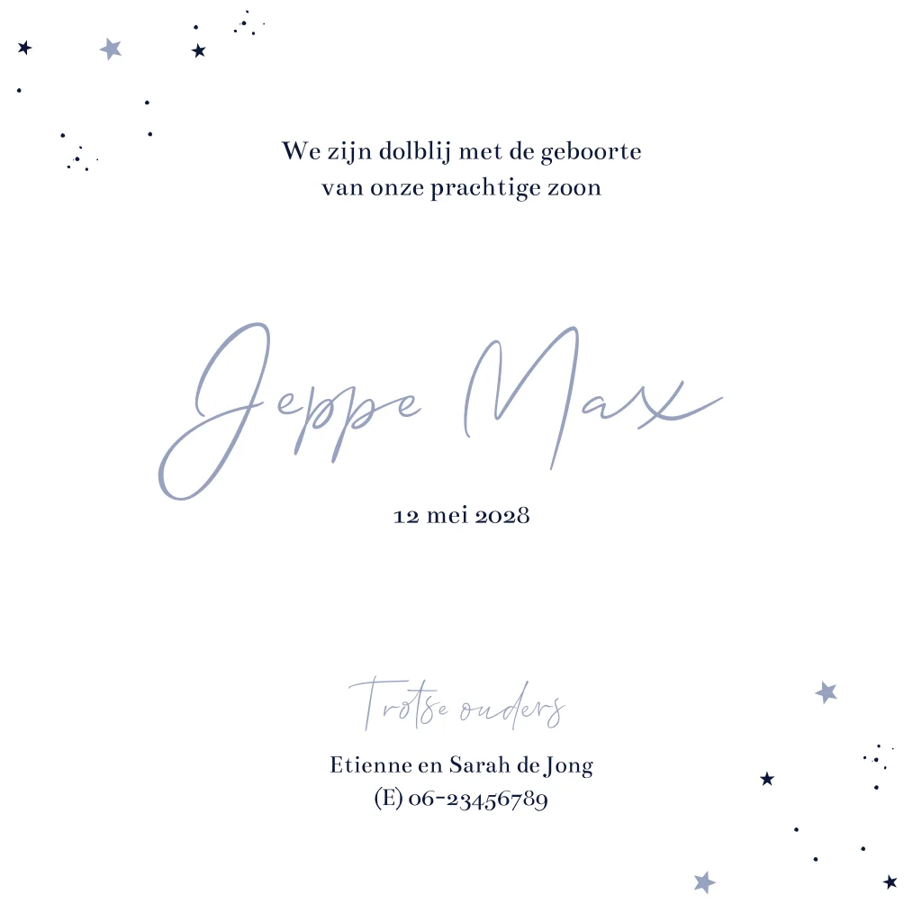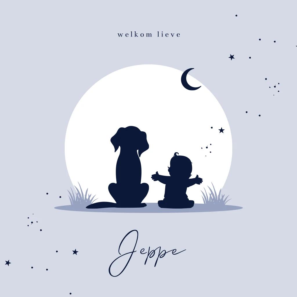 Een prachtig geboortekaartje in zachtblauwe tint met een silhouet illustratie van een baby jongetje en een hondje die samen naar de zonsondergang kijken. De maan en sterren staan al aan de hemel. In sierlijke letters komt de naam van je pasgeboren zoontje onderaan. Aan de binnenzijde komt het silhouetje terug en kun je alle geboortegegevens van je kleine plaatsen. Liever andere kleuren? Pas dit geboortekaartje eenvoudig aan in onze editor.
