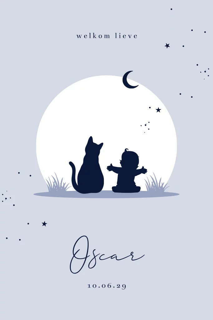 Een prachtig geboortekaartje in blauwe tinten met een silhouet illustratie van een baby jongetje en een lief katje die samen naar de zonsondergang kijken. De maan en sterren staan al aan de hemel. In sierlijke letters staat de naam van je pasgeboren zoontje onderaan. Aan de binnenzijde kun je alle geboortegegevens van je kleine plaatsen. Liever andere lettertypes? Pas dit geboortekaartje eenvoudig aan in onze editor.