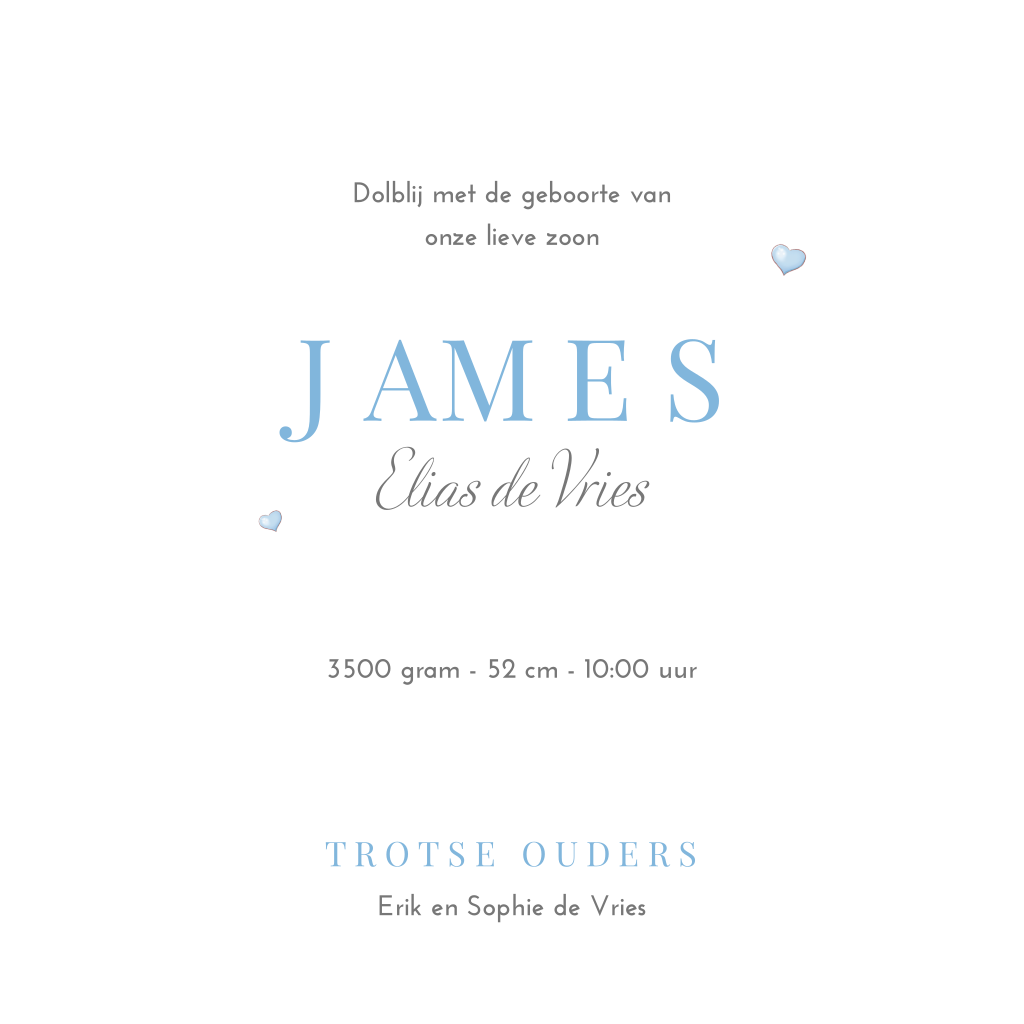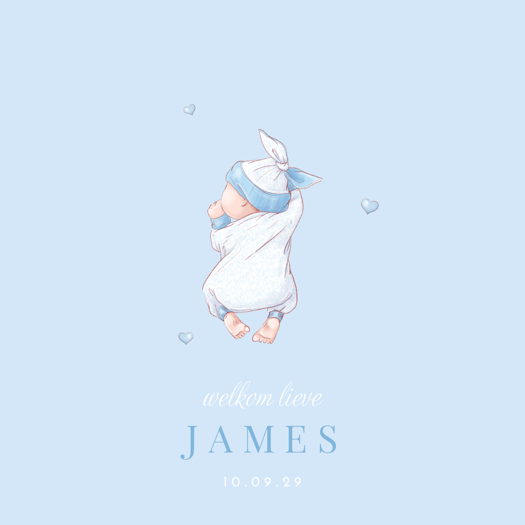 Teder geboortekaartje met een prachtige tekening van een rustende baby jongen, gekleed in een zachtblauw pakje en mutsje. Het kleintje ligt vredig op zijn buikje. Deze ontroerende scène wordt omgeven door hartjes op een zachte blauwe achtergrond. Maak het kaartje helemaal eigen met onze handige editor en aarzel niet om een drukproef aan te vragen, zodat het eindresultaat helemaal naar wens is.