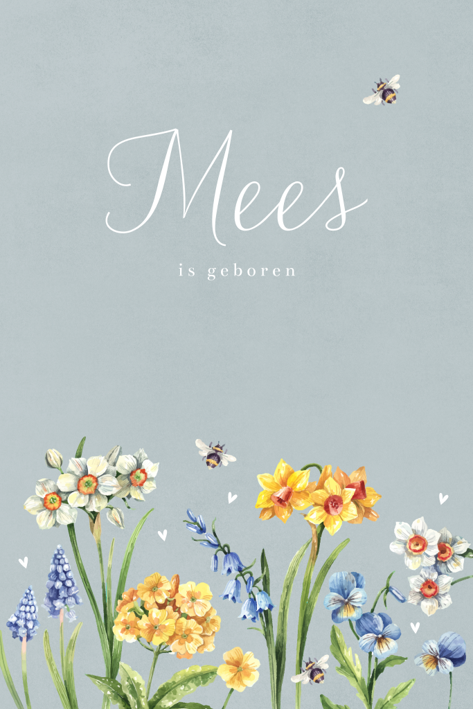 Blauw geboortekaartje met voorjaarsbloemen en bijen