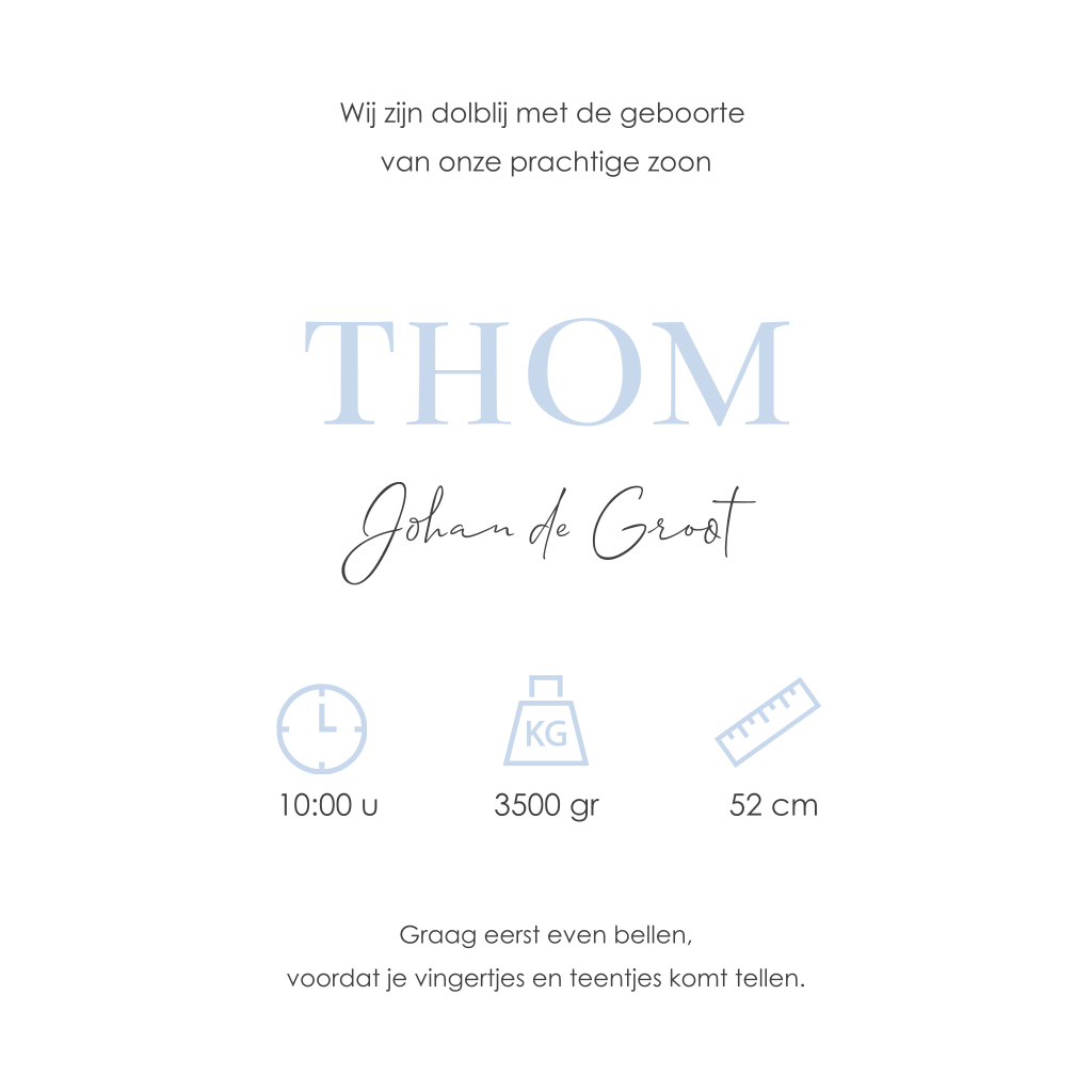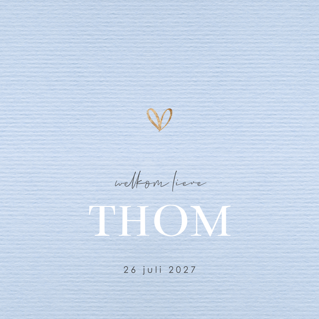 Lief geboortekaartje met blauwe kraftlook achtergrond. Voorop staat de naam van je pasgeboren kindje met grote, chique letters. Boven de naam zie je een gouden hartje. Aan de binnenkant keert het hartje terug en kun je de gegevens naar eigen voorkeur aanpassen.