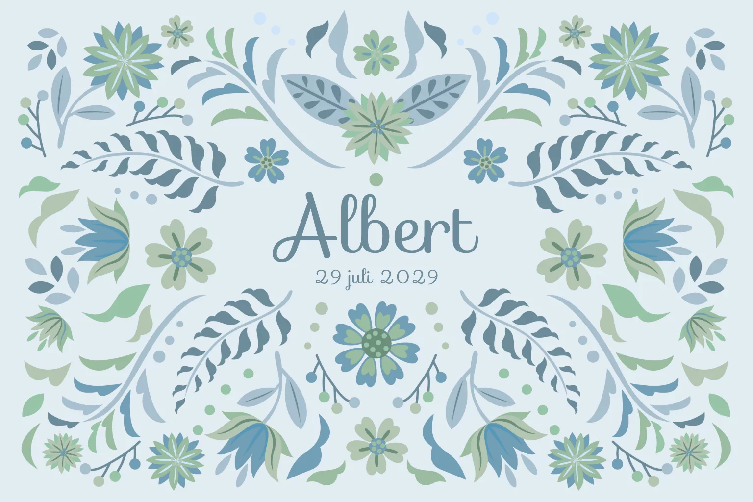 Vier de komst van je zoontje met dit prachtige blauwe geboortekaartje met symmetrische bloemenmotieven in blauw en groen. Pas het ontwerp eenvoudig aan in onze editor en bestel een proefdruk van dit retro geboortekaartje om het eindresultaat eerst even te zien.