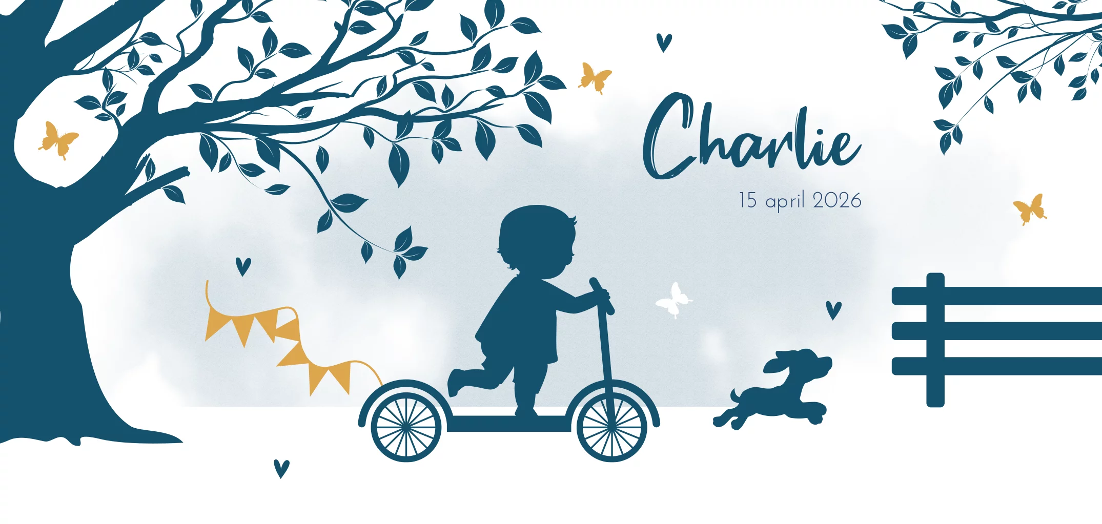 Ben jij op zoek naar een leuk lente geboortekaartje? Dit lieve silhouet kaartje past met de lichtblauwe waterverf en vrolijke illustratie perfect bij de lente. In het midden zie je een jongetje op de step met een okergele slinger achter zich aan. Op de achterzijde keert de illustratie terug en kun je alle geboortegegevens kwijt