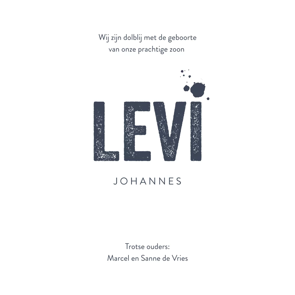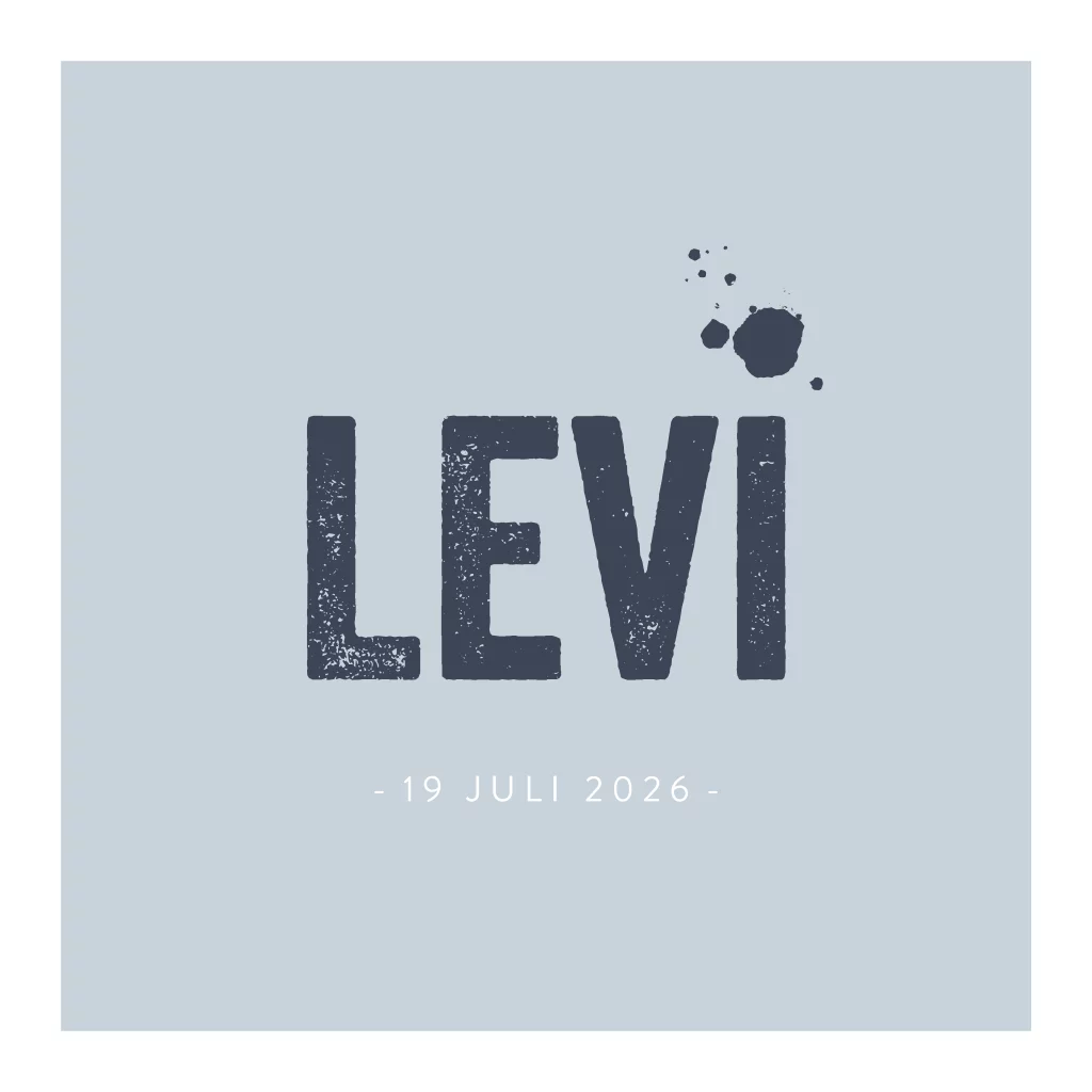 Minimalistisch blauw geboortekaartje met robuuste typografie. Dit geboortekaartje is eenvoudig, stoer en de perfecte keuze voor iedereen die niet van teveel poespas houdt. De kaart heeft een wit kader op de voorzijde met robuuste typografie met zachtblauwe achtergrond. Aan de binnenkant van het kaartje kun je de overige geboortegegevens van je pasgeboren zoontje plaatsen. In onze ontwerptool kun je eventueel ook de kleur van het kaartje aanpassen.
