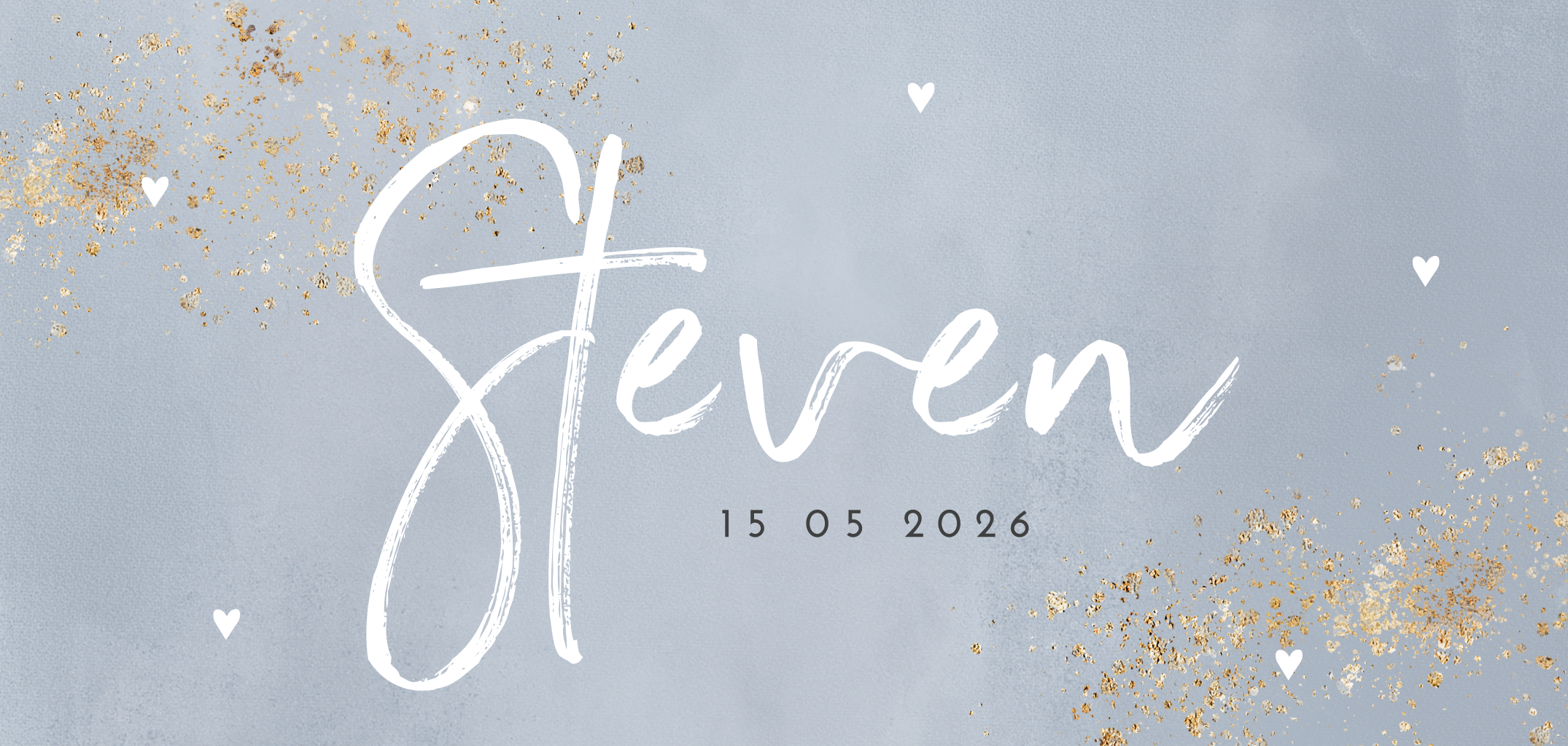 Lief blauw waterverf geboortekaartje voor een jongen met gouden spetters. Bekijk dit mooie waterverf geboortekaartje eens, in de mooie zachtblauwe achtergrond staat groot de naam en eroverheen gouden spetters gestrooid en kleine witte hartjes. De naam van je zoontje staat in een prachtig mooi lettertype. Bewerk de kaart met de designtool en bestel een drukproef om de kaart in het echt te zien.