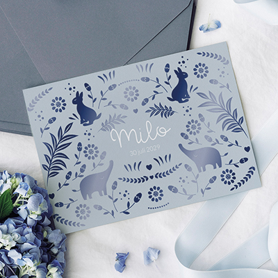 De stoere kleurencombinatie van grijsblauw met donkerblauw zorgt voor een perfecte balans. Ondanks de vele illustraties straalt dit kaartje rust en stijl uit. Perfect voor een unieke en moderne aankondiging!