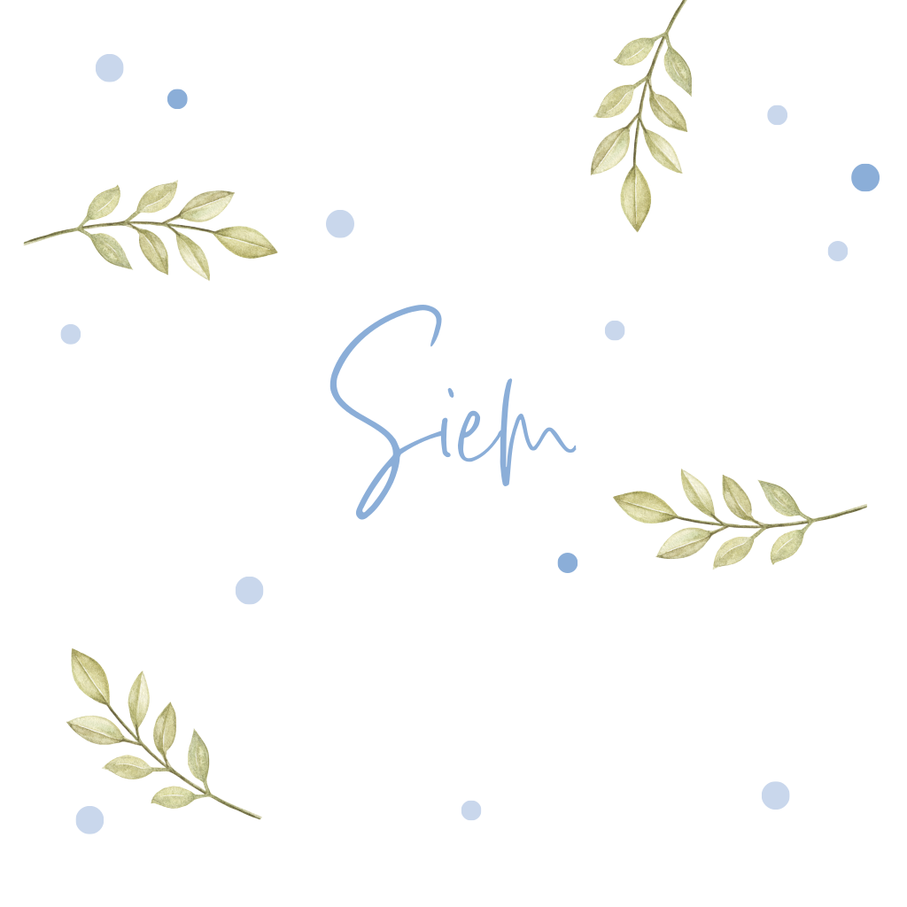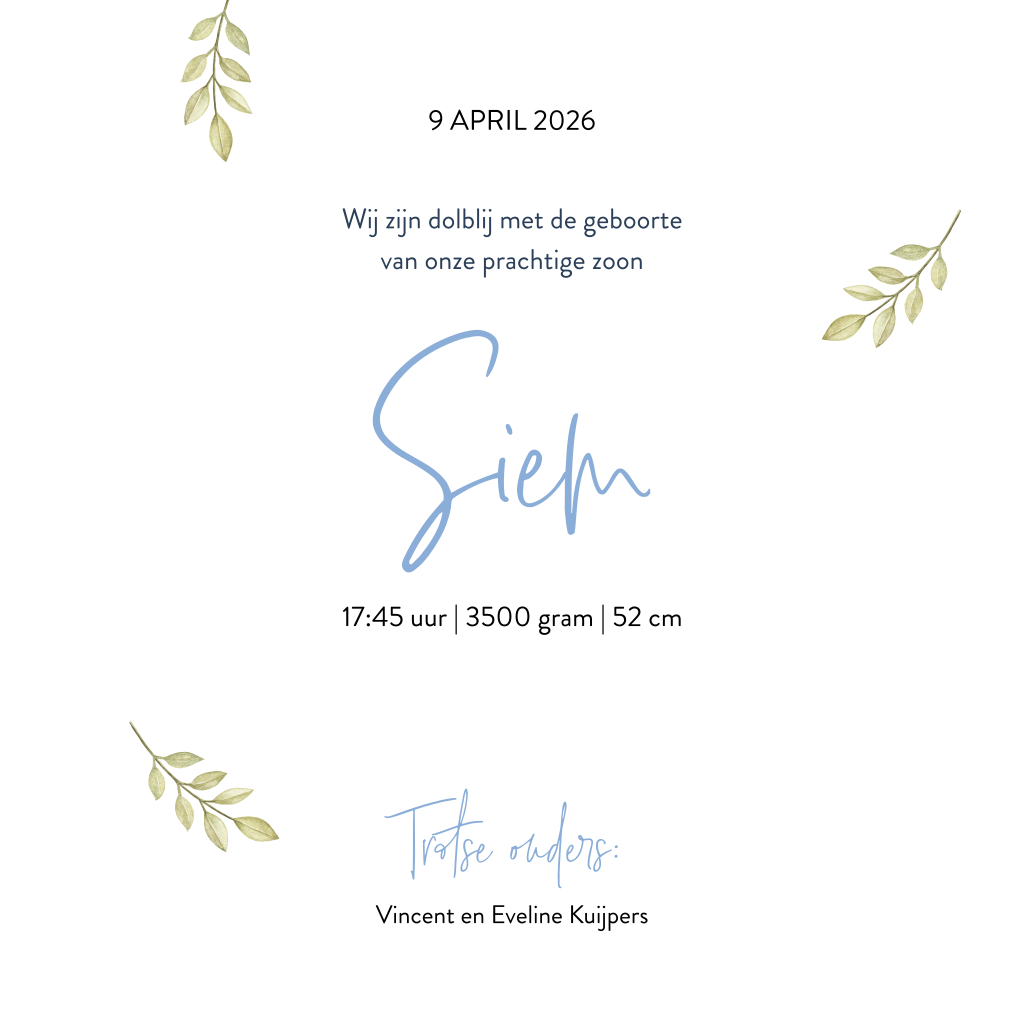 Dit lieve geboortekaartje op een vierkant formaat is erg leuk om de geboorte van jullie zoon wereldkundig te maken. Voorop staat de naam van jullie zoon in een speels lettertype. De naam is omringt door speelse groene bladeren en zachtblauwe stippen. Je kunt de kaart zelf naar wens aanpassen met de editor. Bestel een drukproef om de kaart in het echt te zien.