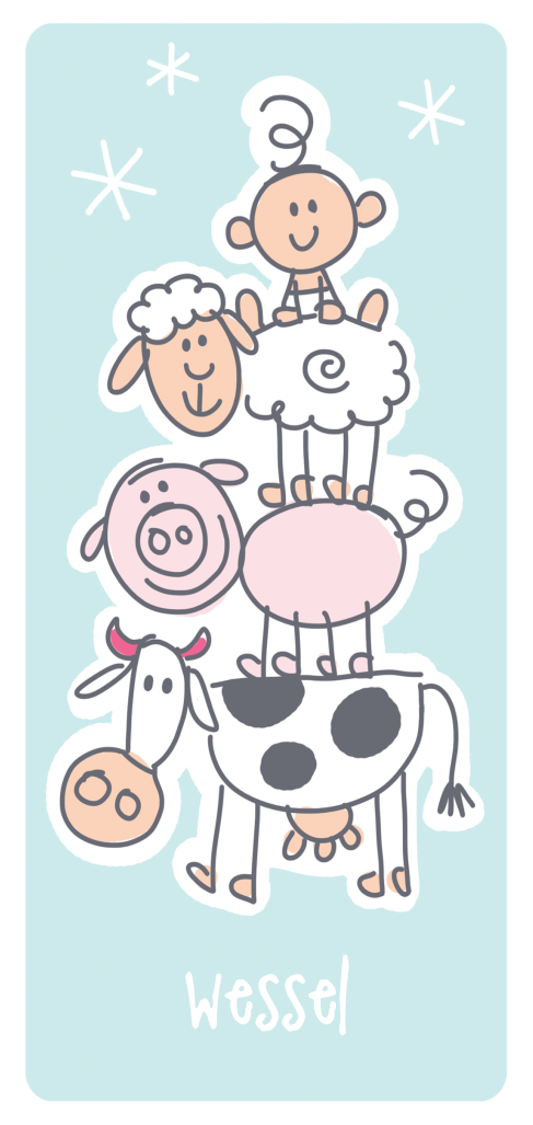 Geboortekaartje met jongetje bovenop een stapel boerderijdieren. Vinden jullie boerderijdieren ook zo leuk? Misschien is dit wel een kaartje voor jullie. Op dit ontwerp zie je een koe, varkentje en een schaapje op elkaar staan. Op de top zit jullie zoontje.