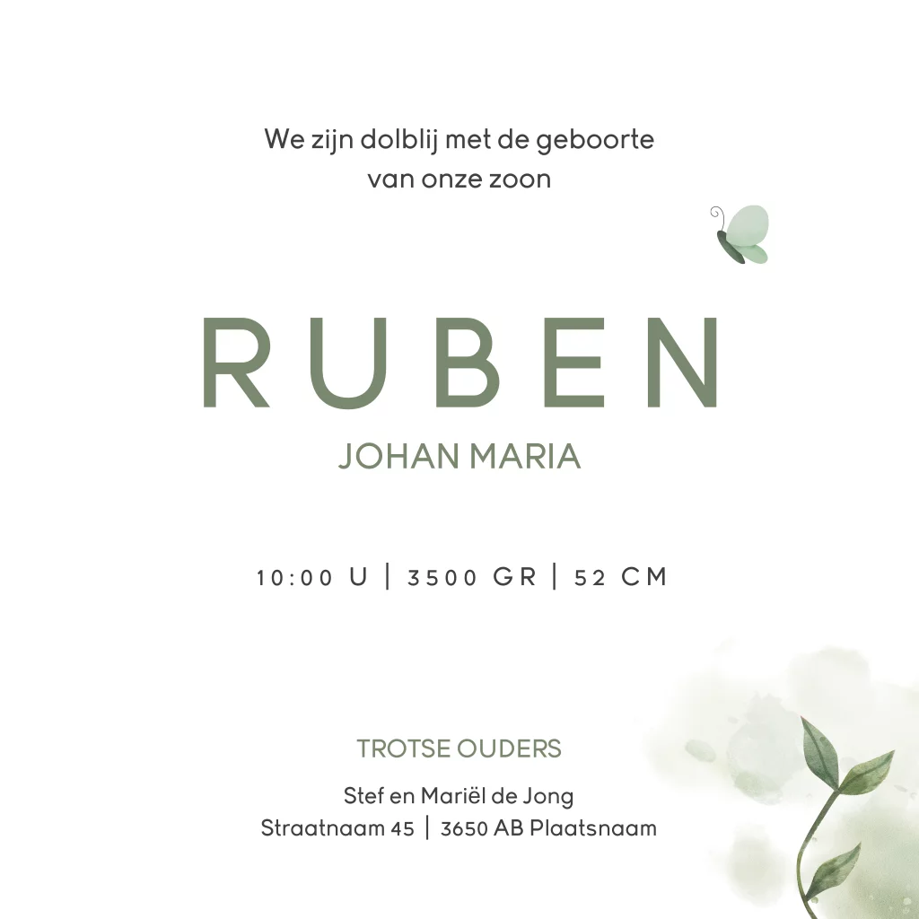 Speelse geboortekaart met dieren van waterverf en initiaal. Vrolijk geboortekaartje met botanisch tintje. Op de voorzijde staat een initiaal, geschilderd met waterverf. Rondom de letter zie je vrolijke illustraties van een olifant, een vlinder en een konijntje. Heb je liever een andere illustratie? Kijk bij het mapje Aquarel illustraties voor meerdere dieren. In de map Alfabet vind je alle letters.
