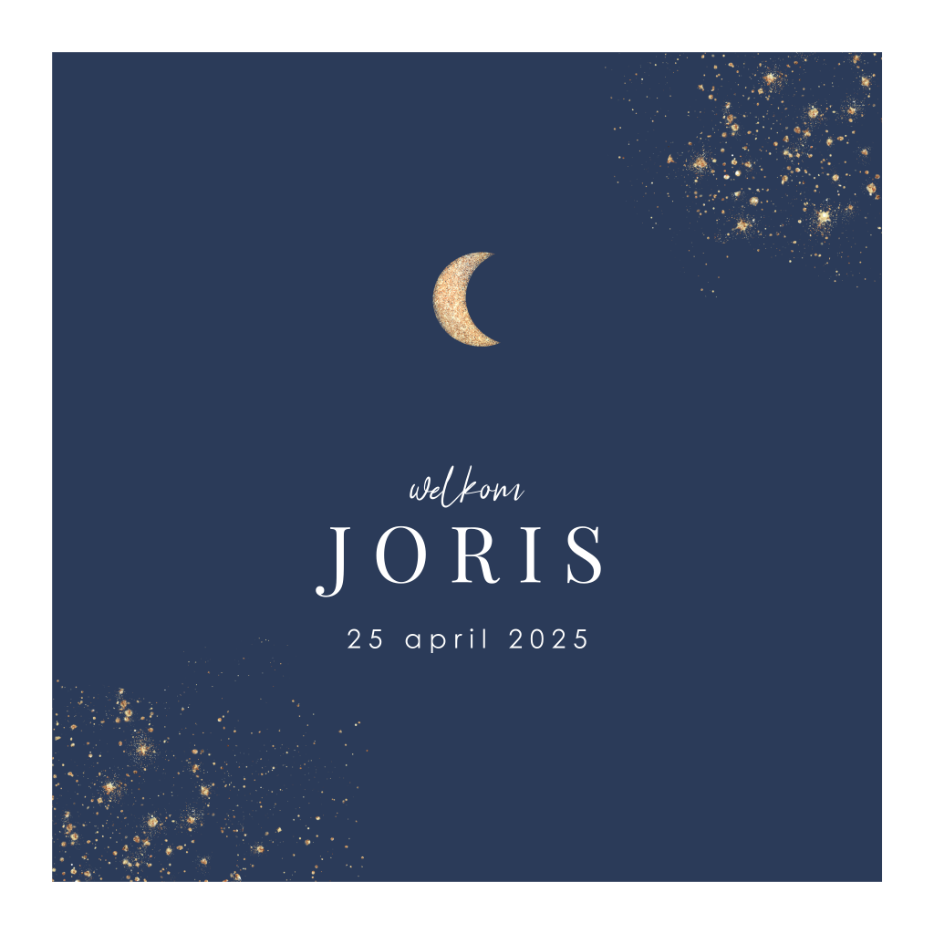 Donkerblauw geboortekaartje met goudkleurige maan en spetters