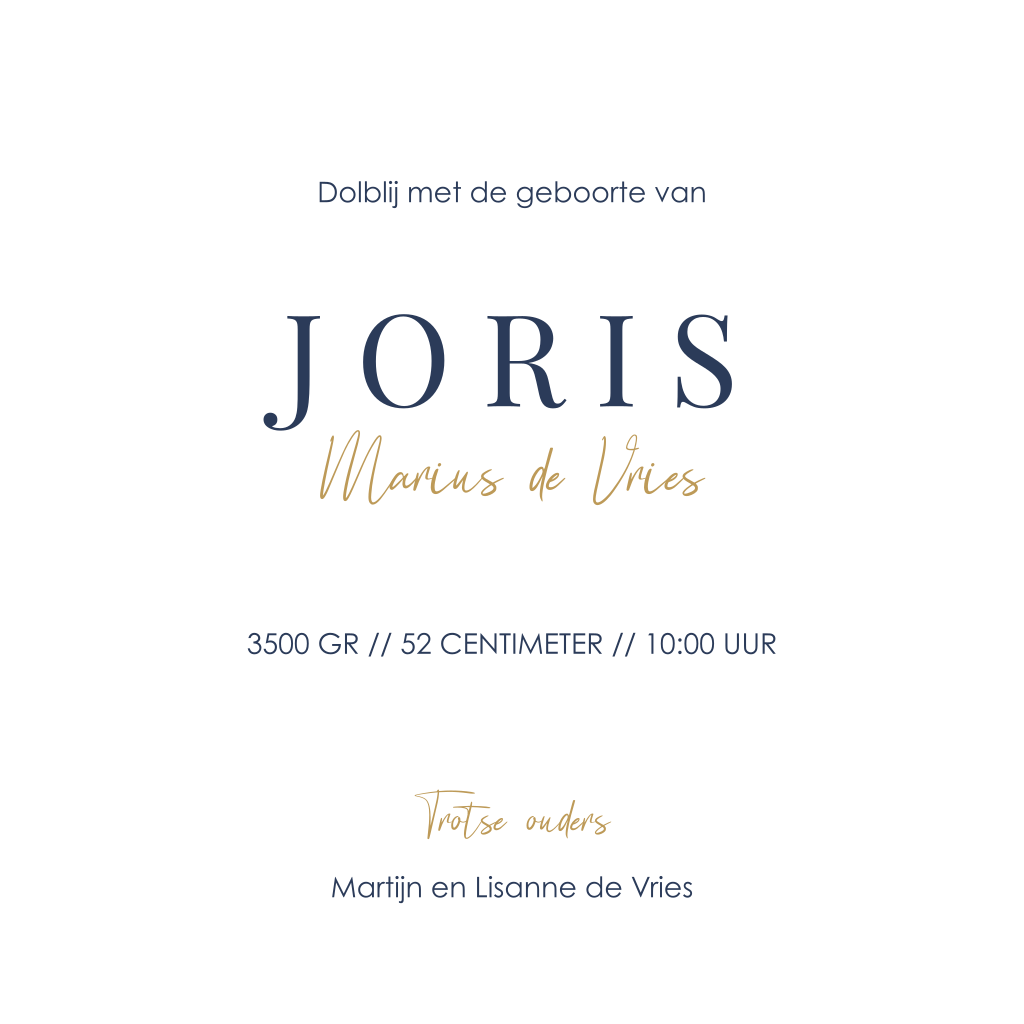 Blauw geboortekaartje met spetters en goudkleurig maantje. Lief geboortekaartje met zachte uitstraling. De kaart heeft een donkerblauwe achtergrond en is versierd met goudkleurige spetters en een maantje. Stijlvolle en sierlijke typografie wisselen elkaar af. Liever een wat speelser lettertype? Dat kan natuurlijk. Je kunt deze kaart makkelijk eigen maken in de ontwerptool. Zo kun je de achtergrond veranderen en de teksten wijzigen.