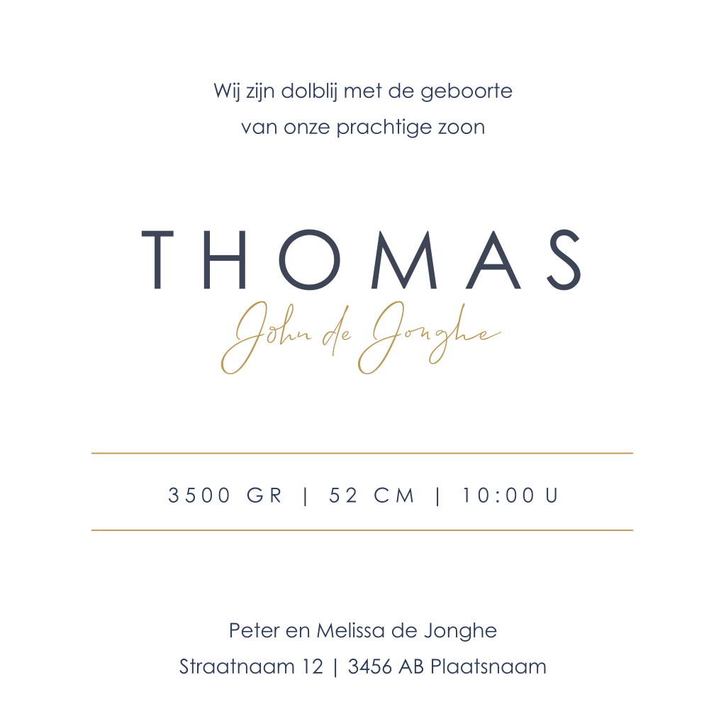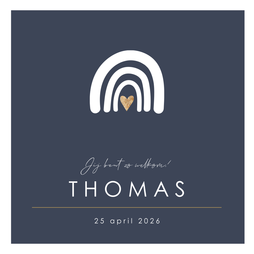 Geboortekaartje regenboog met goudkleurig hartje. Dit lieve geboortekaartje voor een jongen heeft een donkerblauwe achtergrond. Op de voorzijde zie je een witte regenboog met goudkleurig hartje in het midden. Strakke en sierlijke lettertypes wisselen elkaar af en geven de kaart een stijlvolle uitstraling. Is blauw niet jouw kleur? In de ontwerptool pas je de kleur naar wens aan.