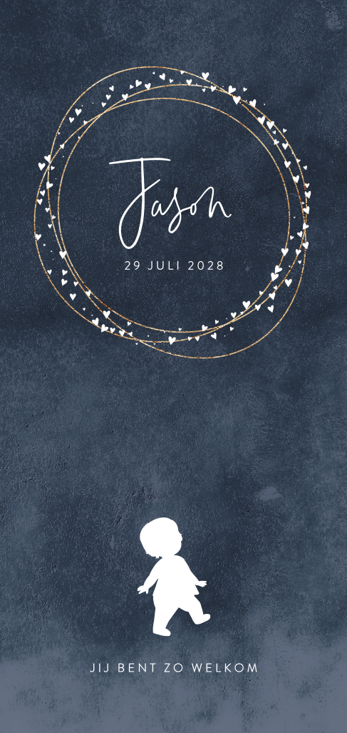 Donkerblauw waterverf geboortekaartjes met naam in goudkleurige cirkels en witte hartjes. Onder de cirkels zie je een jongetje in silhouet. Op de achterzijde kun je de geboortegegevens plaatsen. Is het kaartje nog niet helemaal naar wens? In onze ontwerptool maak je het kaartje gemakkelijk af.