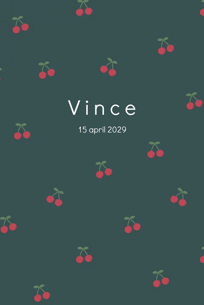 Een eigentijds geboortekaartje met karakter! De diepe donkergroene achtergrond in combinatie met speelse kersen geeft dit kaartje een stoere, maar toch frisse uitstraling. De luxe goudfolie laat de naam en geboortedatum stralen, terwijl de subtiele details zorgen voor een moderne touch. Perfect voor een jongen en helemaal in lijn met de 'Cherry Coded' trend van dit jaar. Pas het kaartje eenvoudig aan met eigen tekst en kleuren voor een unieke aankondiging! 🍒✨