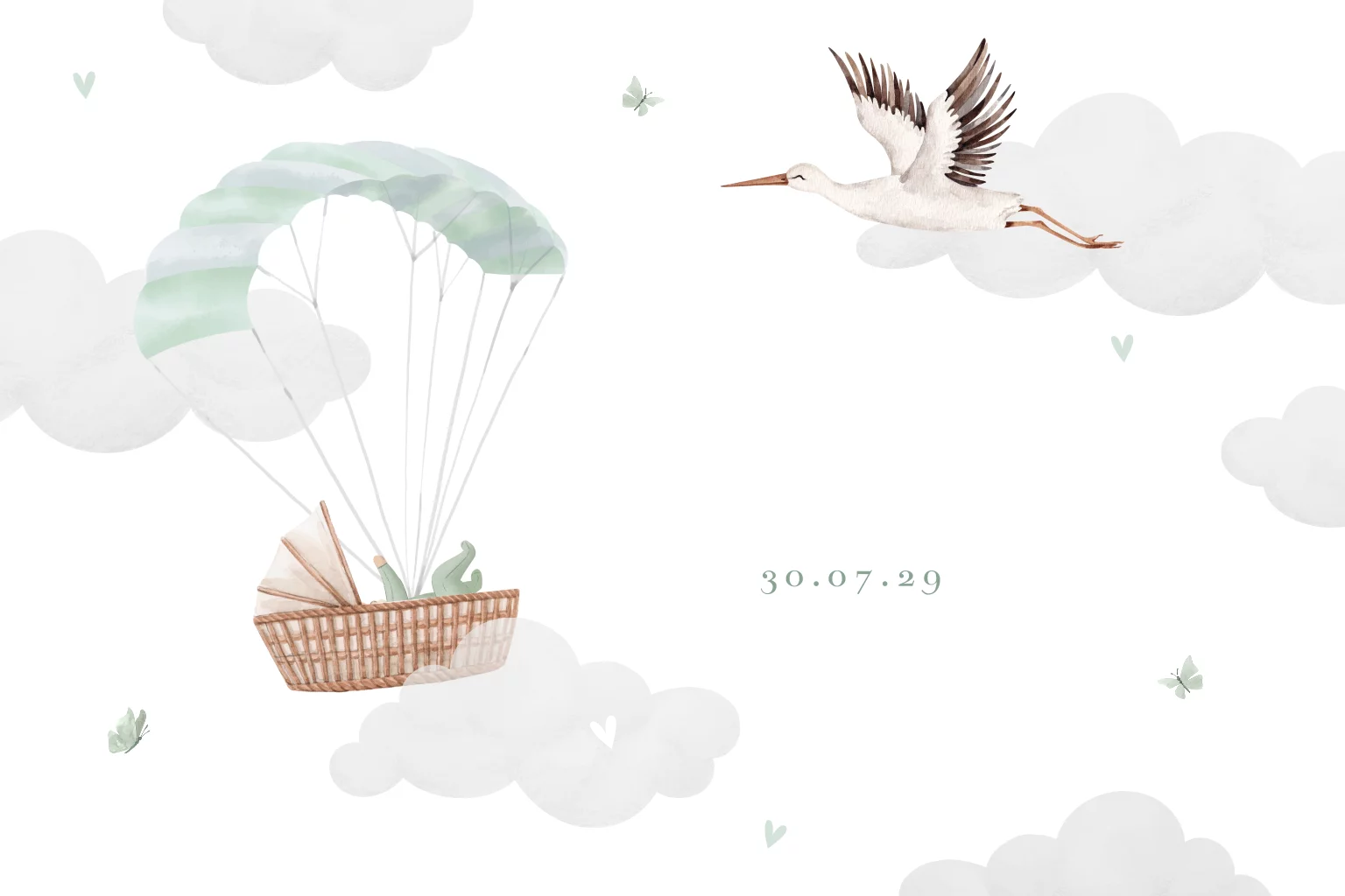 Kondig de komst van je zoontje aan met dit dromerige en lieve geboortekaartje. Een klein wiegje zweeft aan een groene parachute tussen de wolken. De ooievaar mag natuurlijk ook niet ontbreken! Een vrolijk ontwerp met prachtige goudfolie afwerking. Liever zilver- of koperfolie? Pas dit kaartje naar eigen wens aan en bestel een proefdrukje.