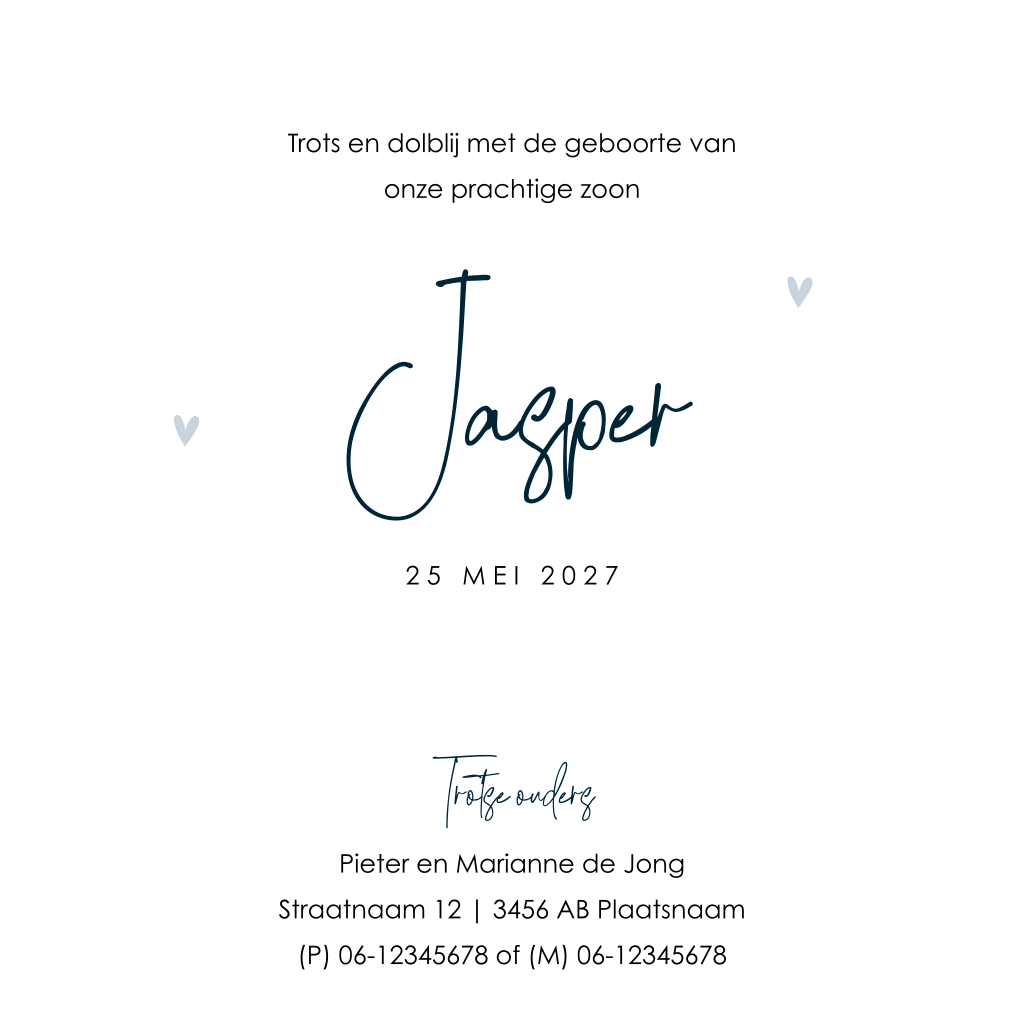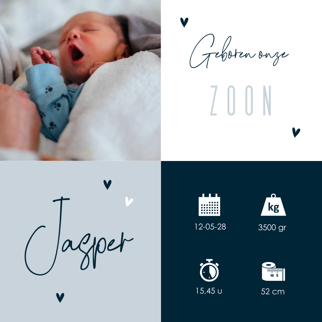 Lief geboortekaartje voor een jongen met voorop een mooie foto van jullie zoontje, de naam en de geboortegegevens als datum, lengte, gewicht en tijd met kleine icoontjes. Verder staat voorop de tekst 'Geboren onze zoon'. Alle elementen op de kaart kun je zelf aanpassen met de ontwerptool.