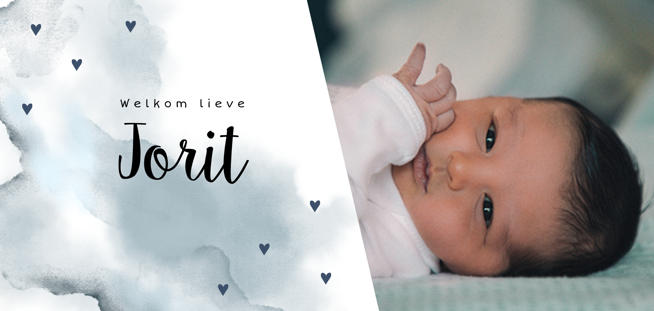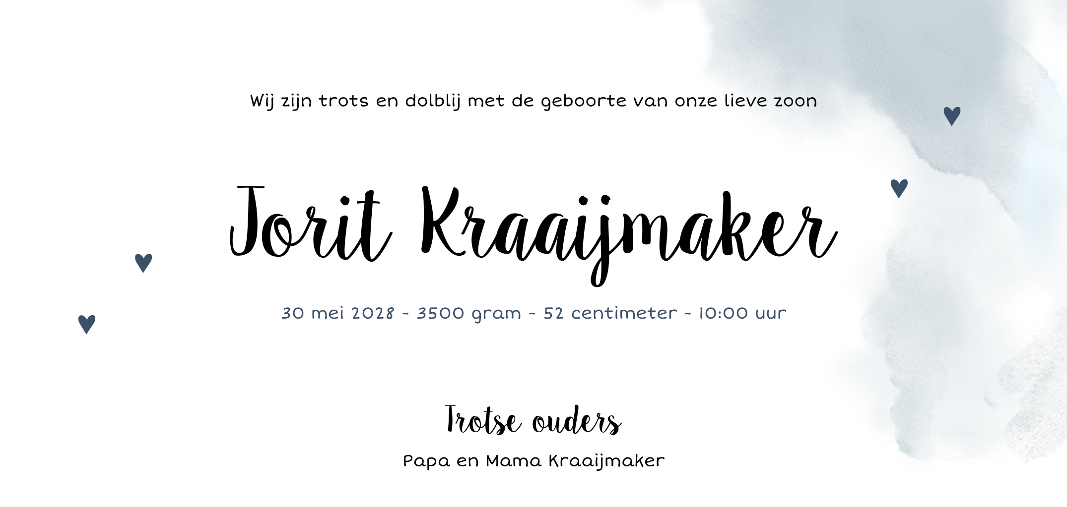 Geboortekaartje met voorop een mooie foto van jullie pasgeboren zoon en is verder versierd met waterverf en blauwe hartjes. Met speelse lettertypes staan alle gegevens op de kaart. Pas de kaart in de ontwerptool naar wens aan om het kaartje zo persoonlijk mogelijk te maken.