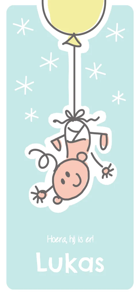 Het is feest want er is een baby jongen geboren! Op dit vrolijke geboortekaartje hangt een jongetje aan z'n luier aan een gele ballon. De achtergrond heeft een pastel blauwe kleur. Pas de lettertypes naar wens aan en bestel een proefdruk.