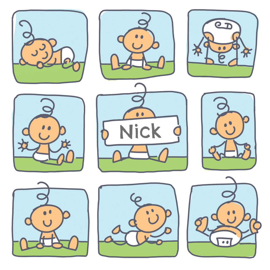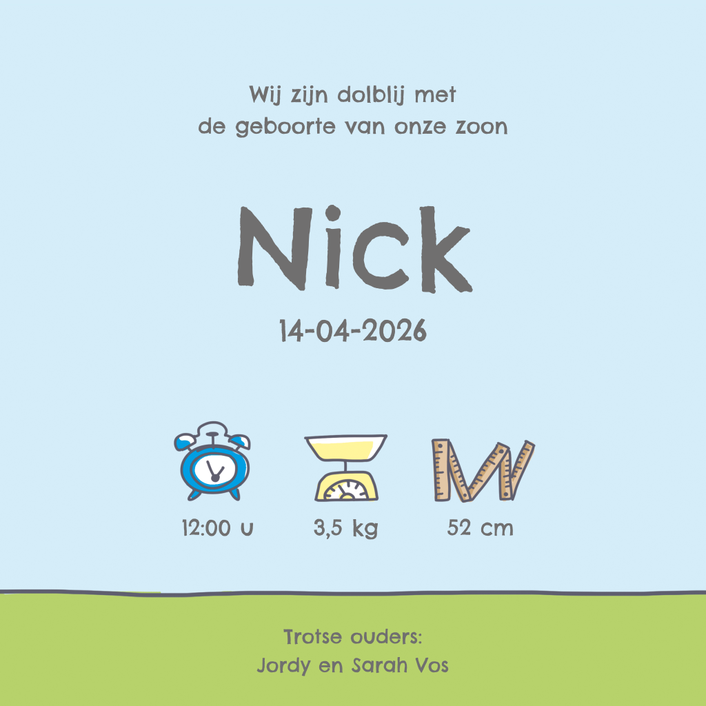 Geboortekaart voor een baby jongen met een collage van illustraties. Dit schattige ontwerp bestaat uit negen kleine tekeningetjes die samen een collage vormen. De baby draagt een banner met daarop de naam van jullie pasgeboren zoon. Binnenin de kaart worden de geboortegegevens aangetoond met kleurrijke icoontjes. Pas de teksten gemakkelijk zelf aan en bestel een proefdruk.