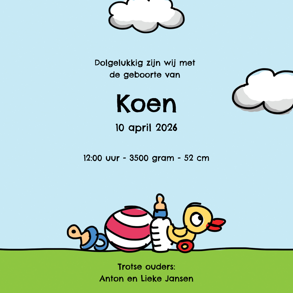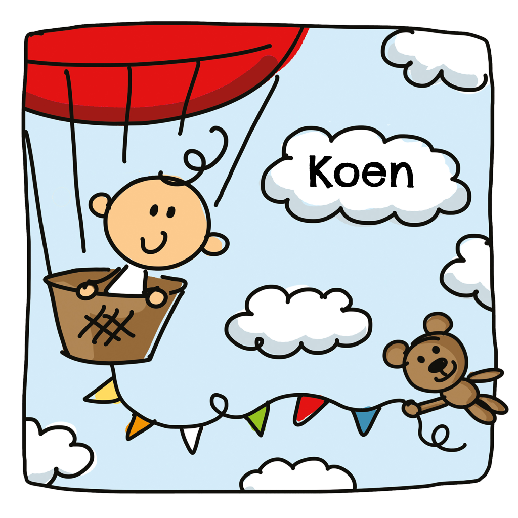 Vierkante geboortekaart met baby jongen in een luchtballon. Op dit schattige geboortekaartje zie je hoe een jongetje in een luchtballon tussen de wolken vliegt. Aan de luchtballon hangt een slinger en een knuffelbeer houd zich aan die slinger vast. Personaliseer het ontwerp en bestel een proefdruk om het kaartje in het echt te bewonderen.