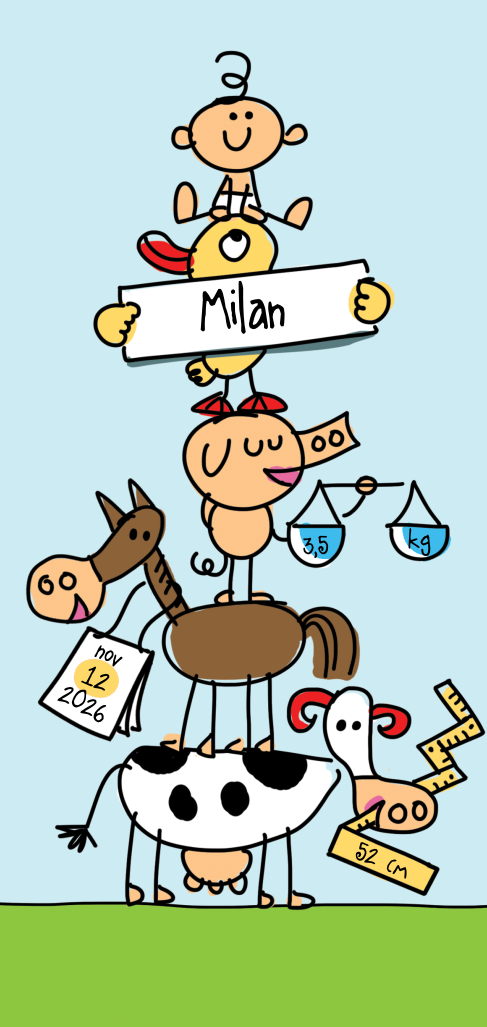 Langwerpig geboortekaartje met vrolijke boerderijdieren die gestapeld op elkaar staat met op de top een baby jongen. Van onder naar boven een koe, paard, varken, eend en bovenop een kleine blije baby. Een vrolijk en kleurrijk geheel om de komst van je zoontje mee aan te kondigen. De lettertypes kun je eventueel naar smaak aanpassen in onze ontwerptool.