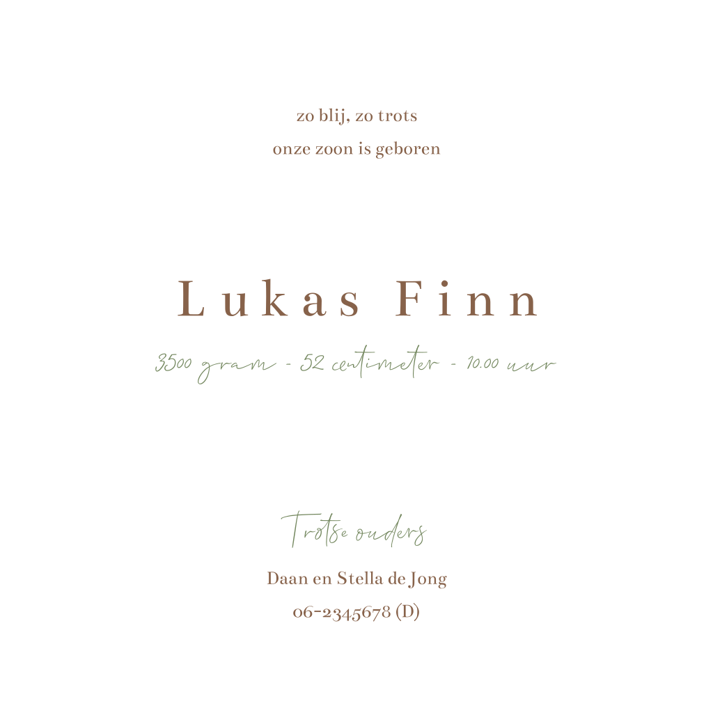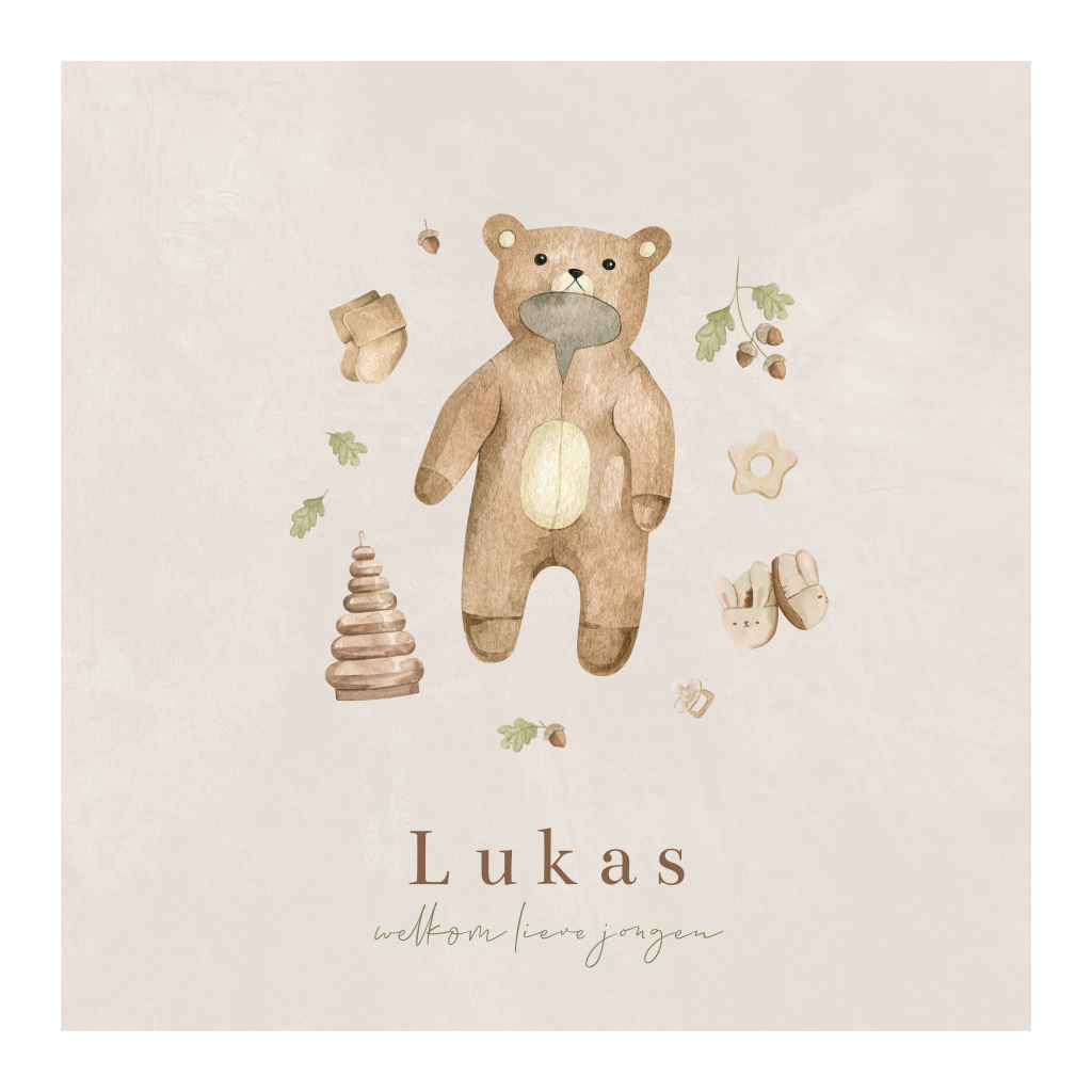 Lief geboortekaartje in beige tint met waterverf illustraties van een berenpakje en allerlei baby items. De eikeltjes en blaadjes maken dit ontwerp helemaal af. Perfect geboortekaartje voor een kindje dat in een van de koudere maanden geboren wordt. Pas dit kaartje zelf aan in onze handige ontwerptool.