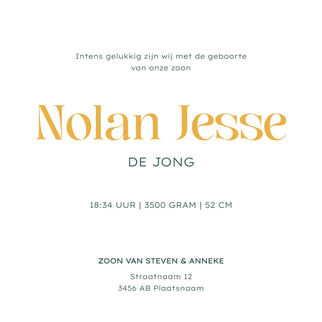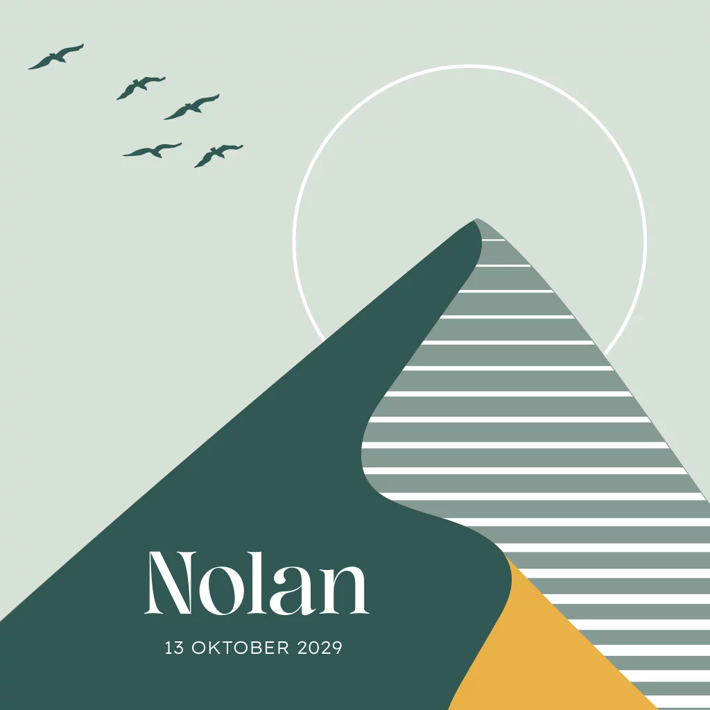 Stoer geboortekaartje voor een jongen, met een hoge berg, zonsondergang en een zwerm vogeltjes. In de editor kun je dit kaartje helemaal naar eigen inzicht aanpassen. Dus zowel de kleuren van de berg als alle teksten.