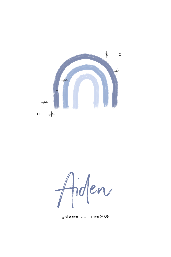 Regenboogjes zijn helemaal van nu. Daarom is dit moderne geboortekaartje helemaal volgens de laatste trends. Voorop de kaart staat een blauw getekend regenboogje omringd door sprankelende sterretjes. Met een stijlvol lettertype staat de naam van je zoontje voorop de kaart. Op de achterzijde is ruimte voor de naam en de geboortegegevens. Pas de kaart naar wens aan in de ontwerptool en bestel een proefdrukje!