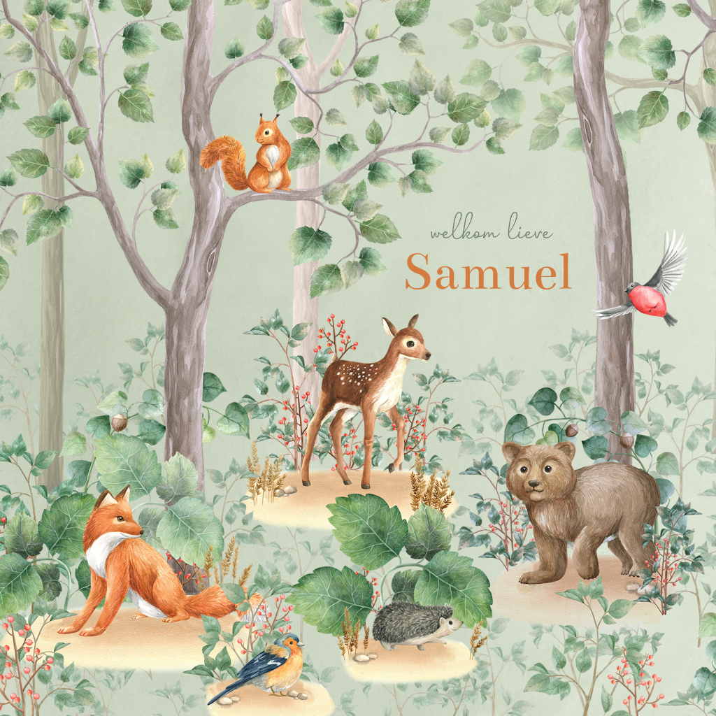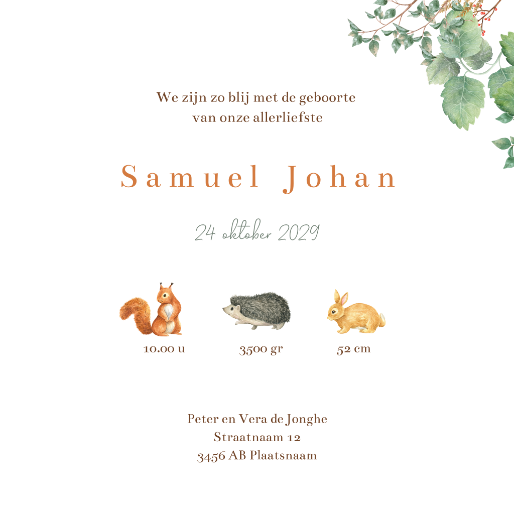 Ontdek dit charmante geboortekaartje met een prachtige illustratie van een bos, bevolkt door schattige dieren. Tussen groene bomen en struiken vind je een vos, hert, egel, konijn, vogeltjes en een speelse eekhoorn. Binnenin het kaartje zijn enkele van deze vriendelijke dieren terug te vinden, waar je de belangrijke geboortegegevens van je kleintje kunt toevoegen. Personaliseer dit kaartje naar eigen wens met onze handige ontwerptool en bestel een proefdruk om het resultaat te bewonderen.