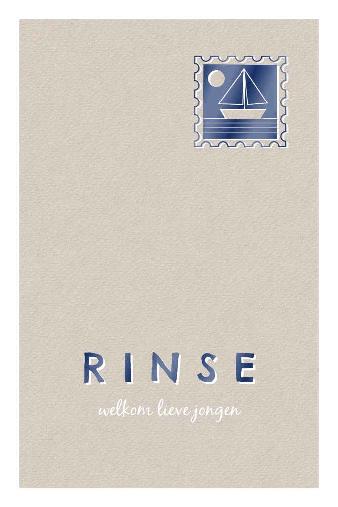 Zandkleurig geboortekaartje met donkerblauwe postzegel met bootje in hoogglans. De naam van je zoontje en de postzegel worden afgewerkt met een glimmend laagje, zo springen deze echt van het papier af. Pas de kleuren of lettertypes van dit geboortekaartje zelf aan in onze ontwerptool.