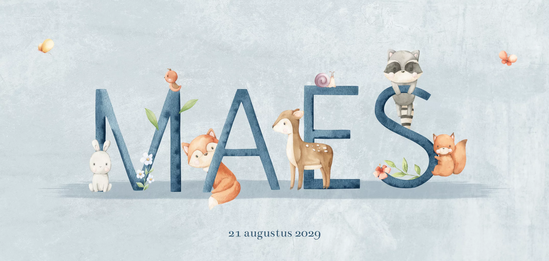 Geboortekaartje met naam in grote letters en bosdieren